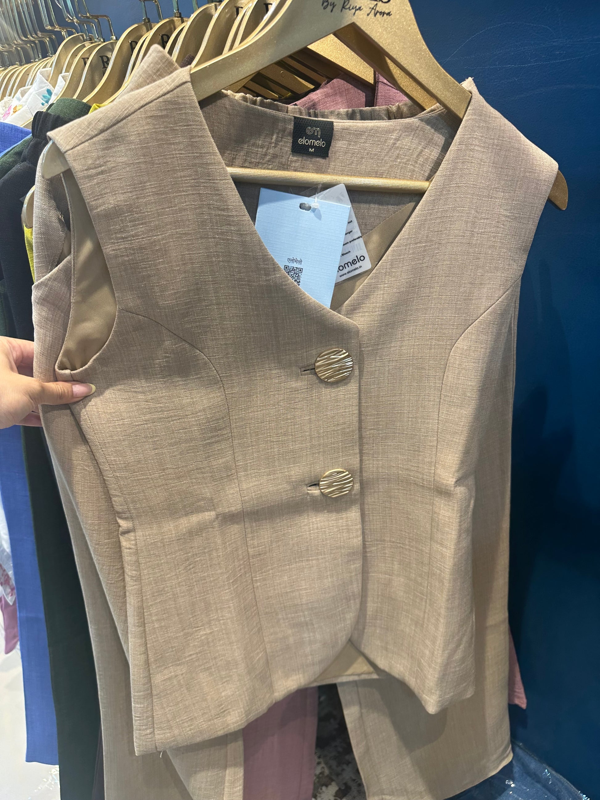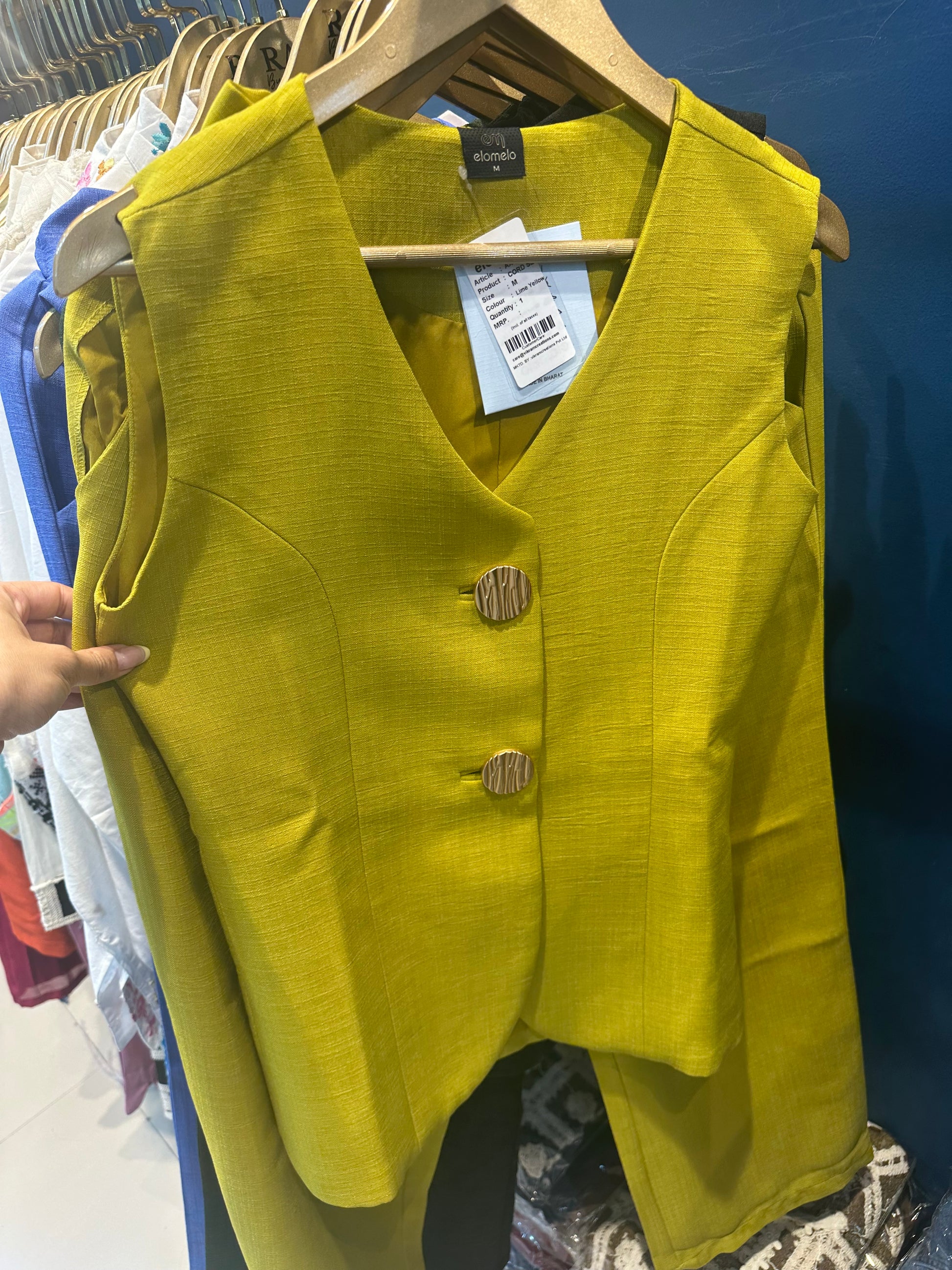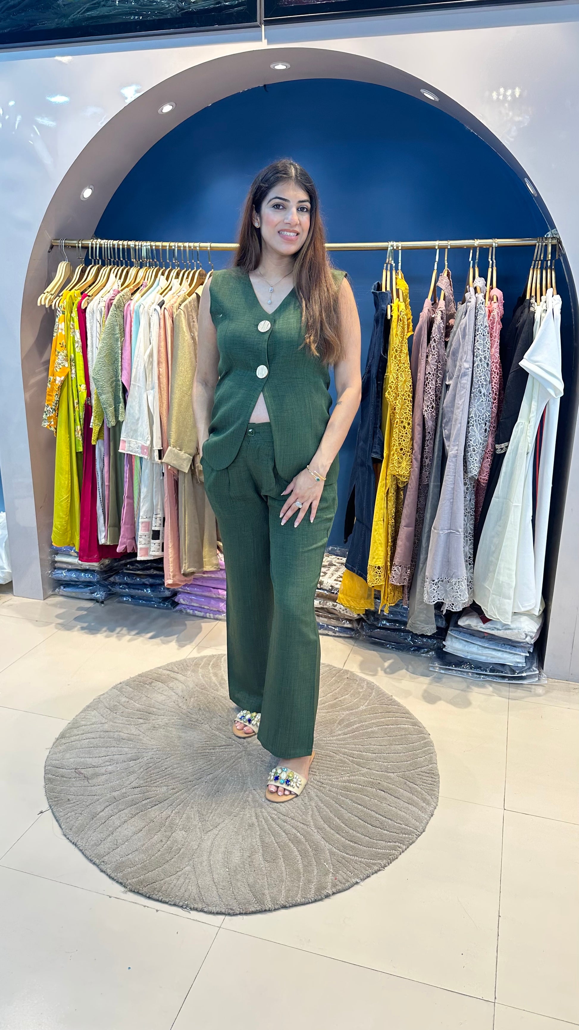 2pc Cotton-Linen Sleeveless Co-ord Set Paired With Bell-Bottom Pants