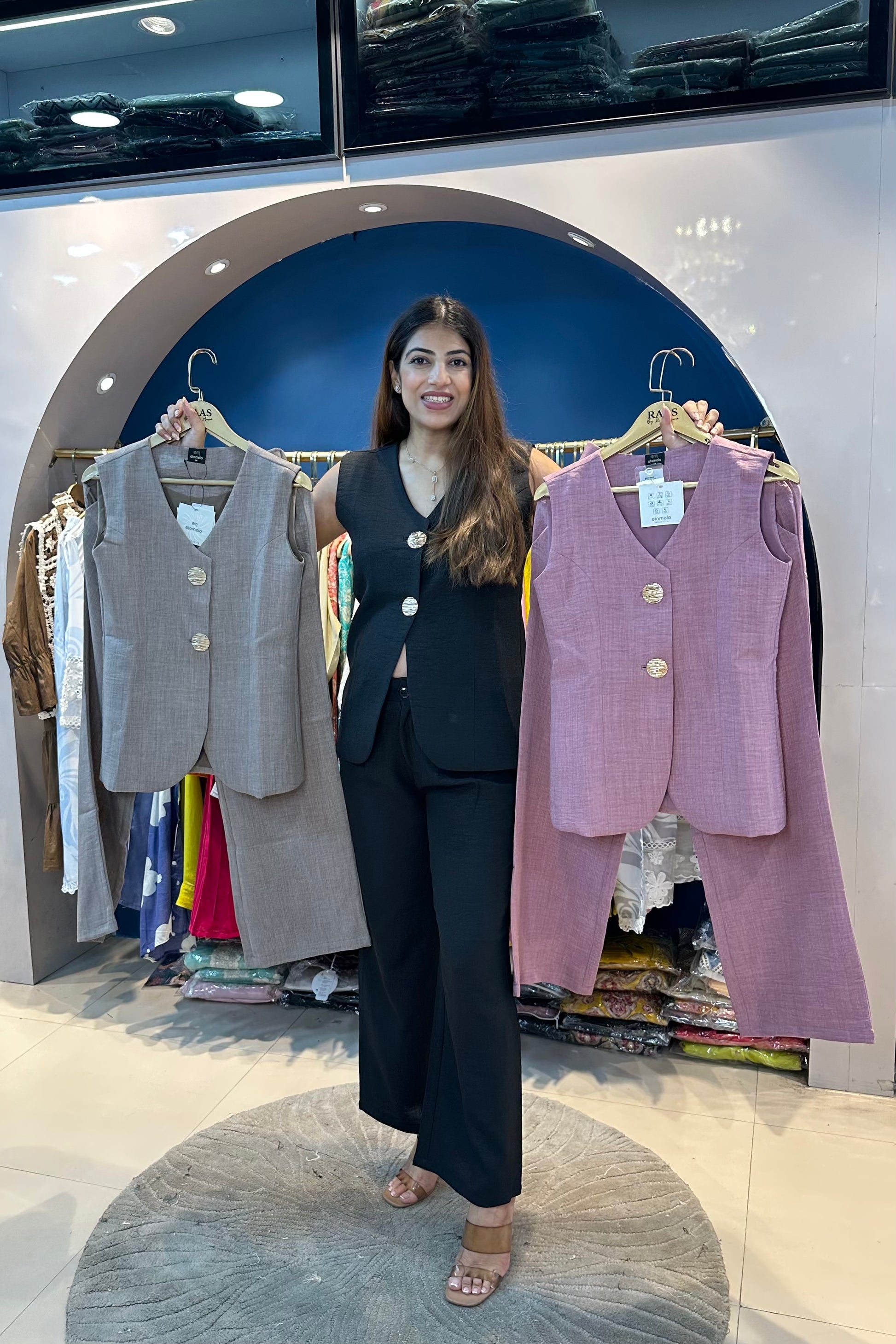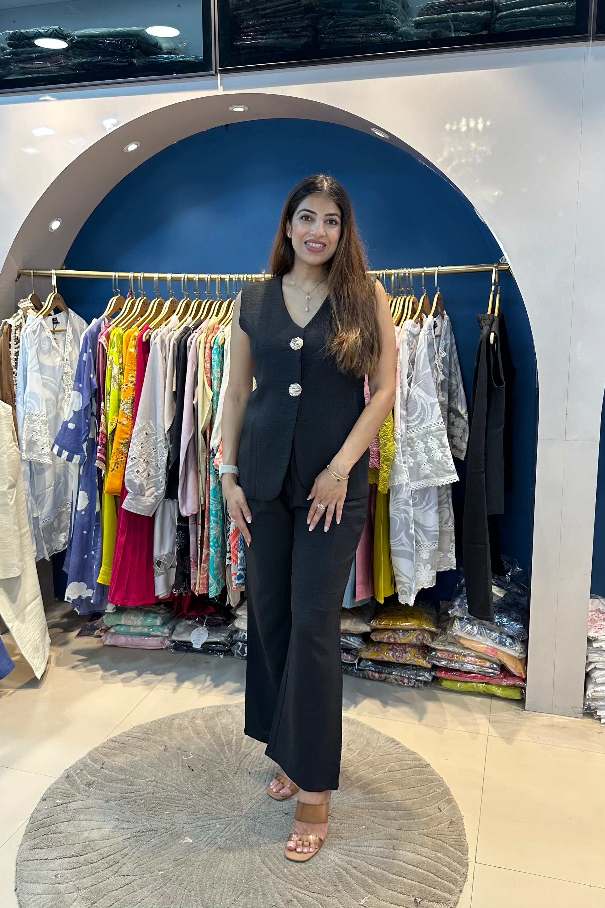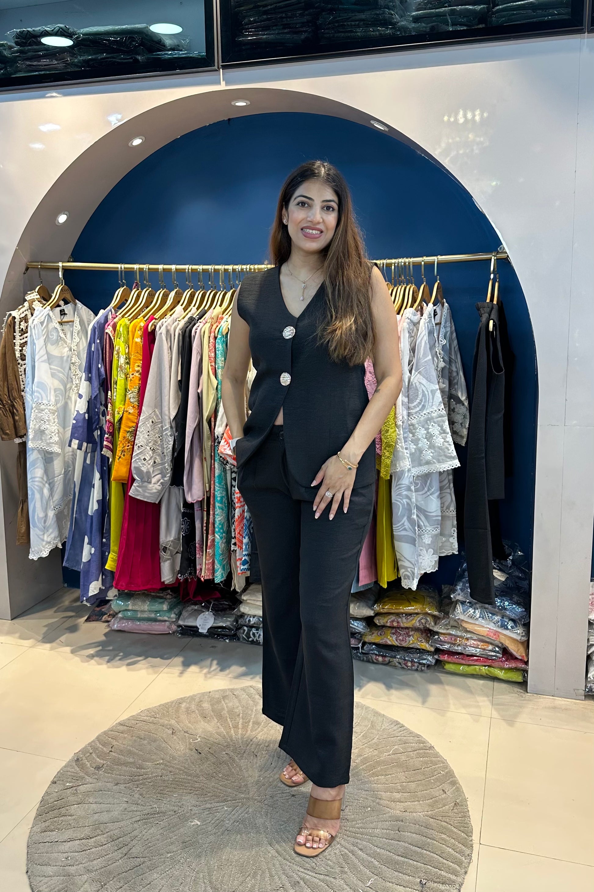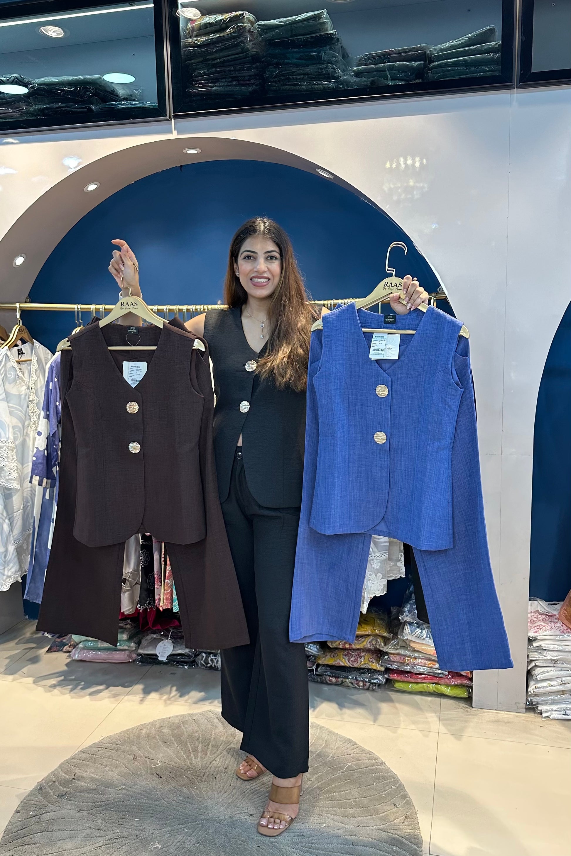 2pc Cotton-Linen Sleeveless Co-ord Set Paired With Bell-Bottom Pants