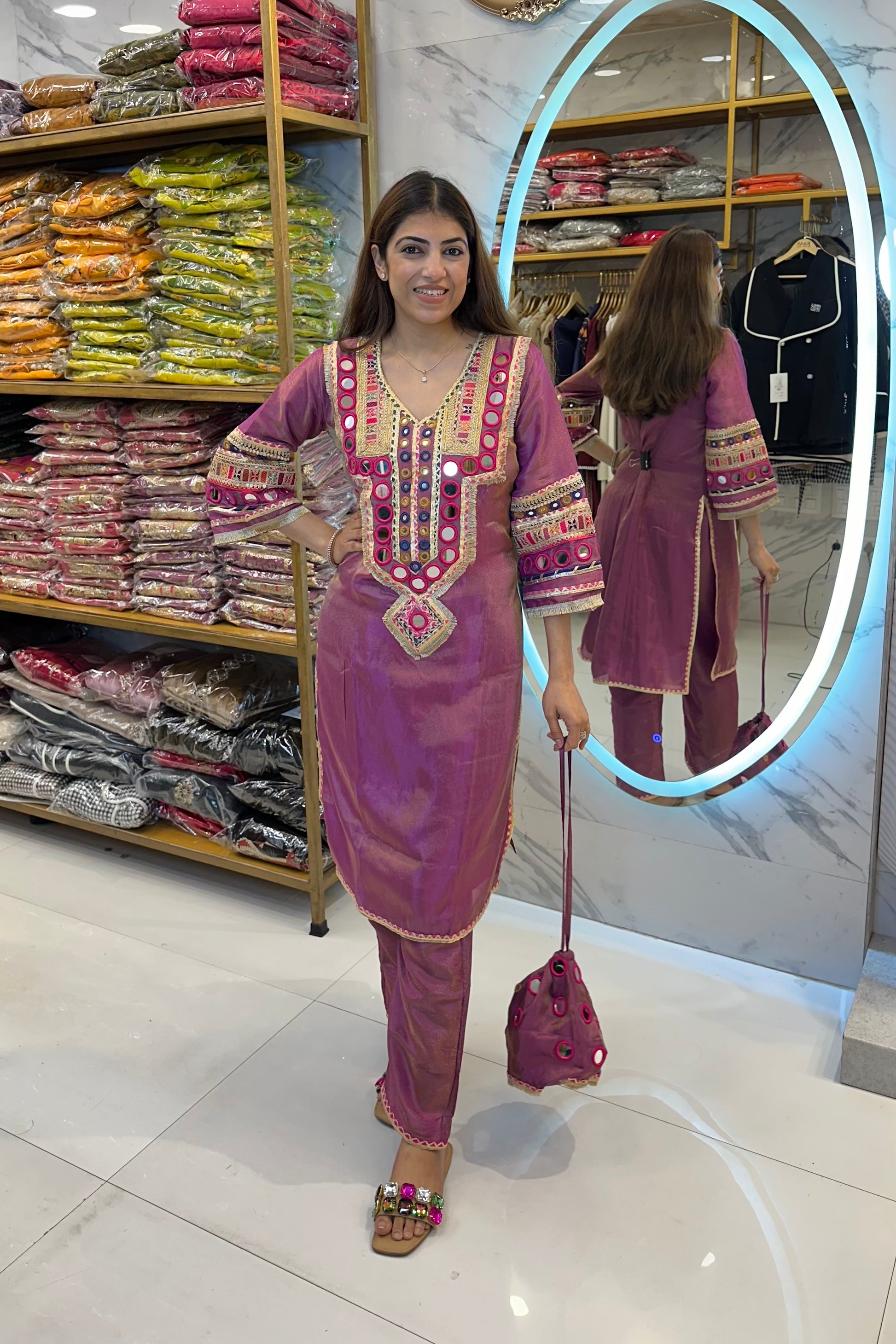 2pc Shimmer Tissue Fabric Partywear Co-ord Set With Potli