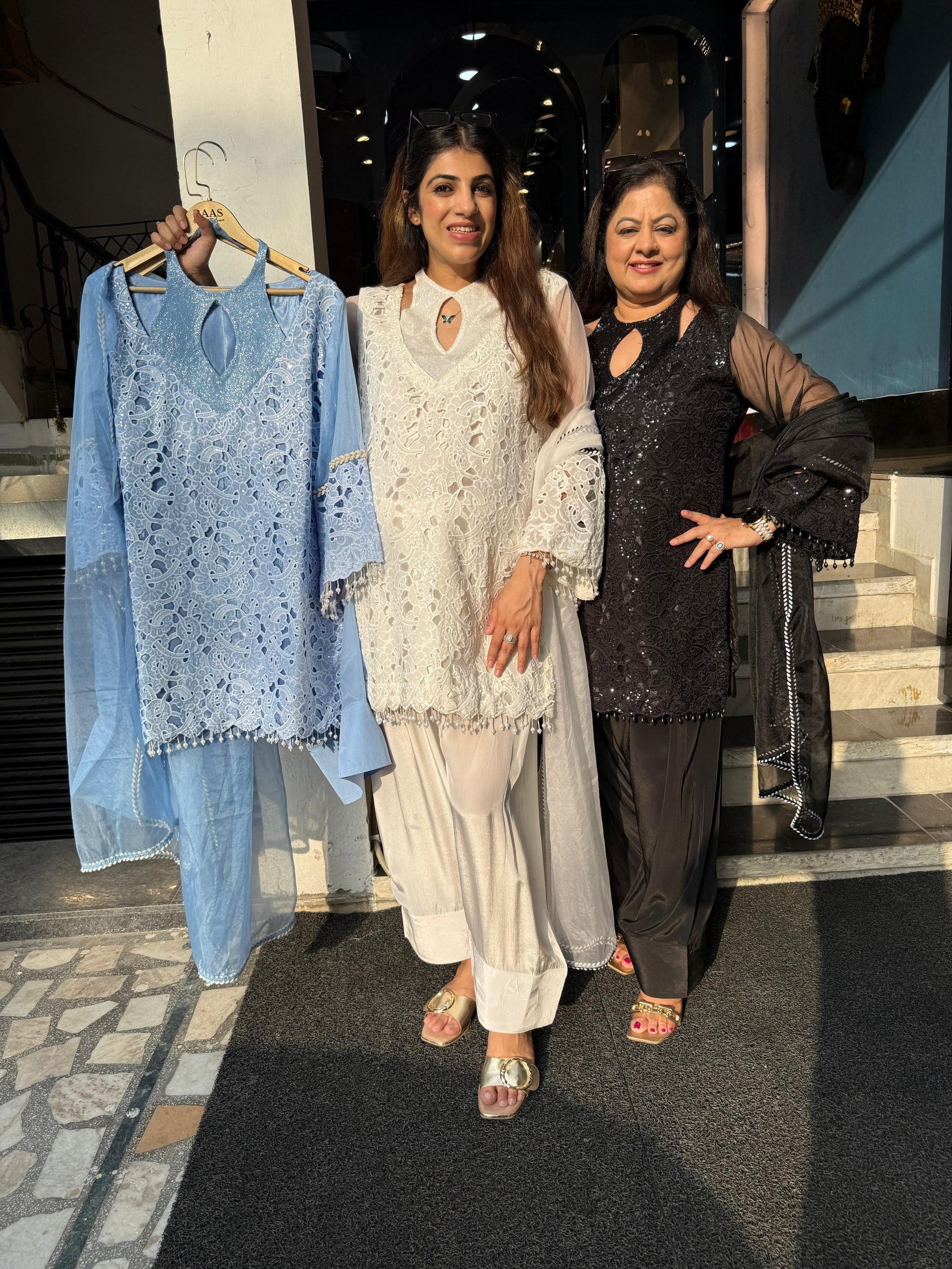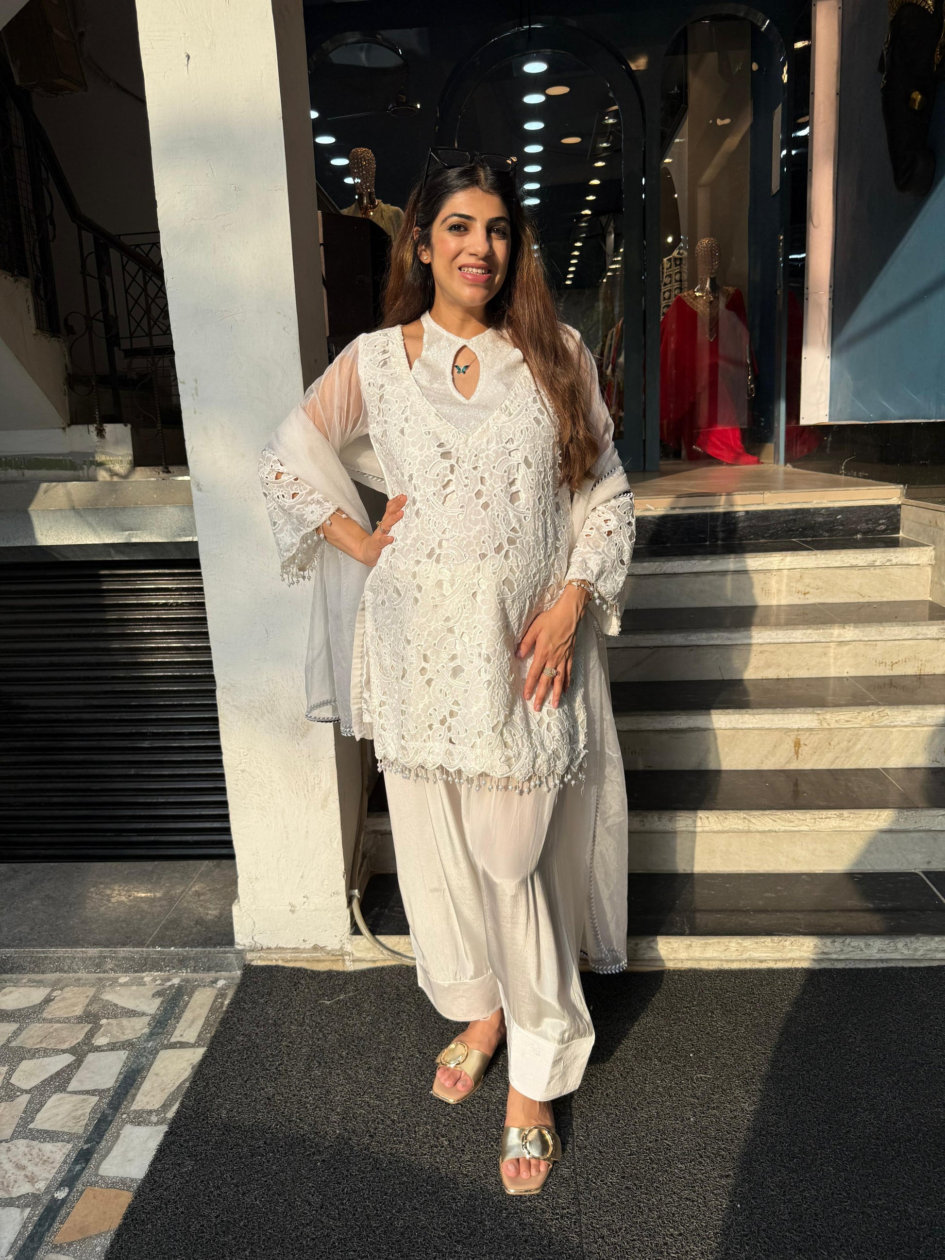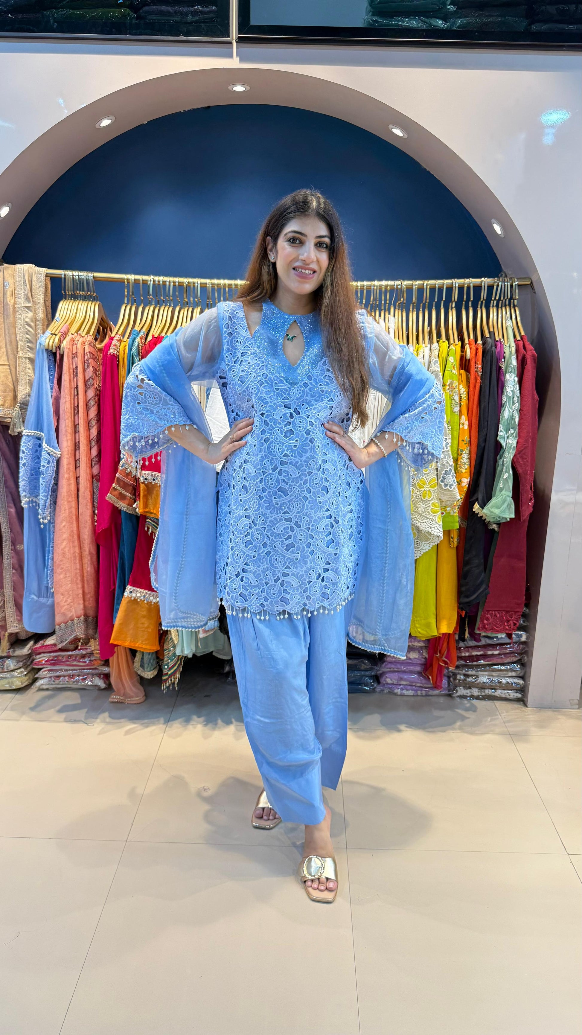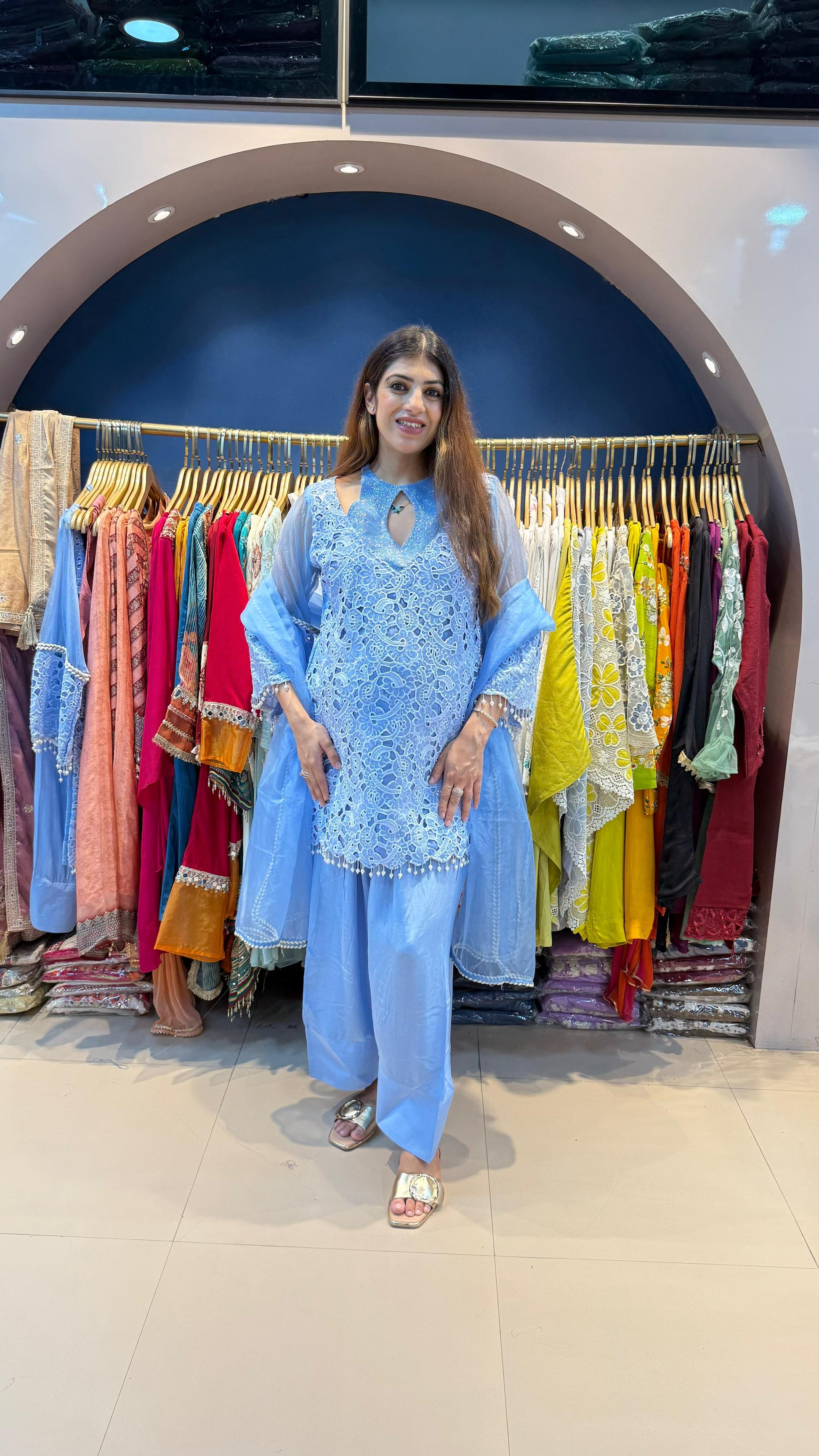Designer Organza Schiffli 3pc Farshi Salwar Suit with Organza Dupatta