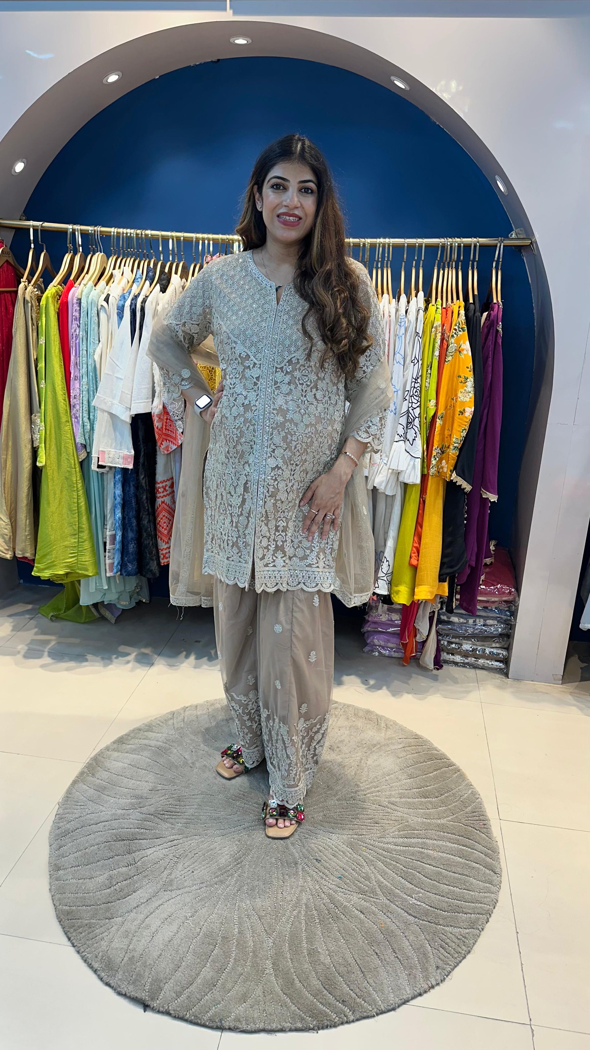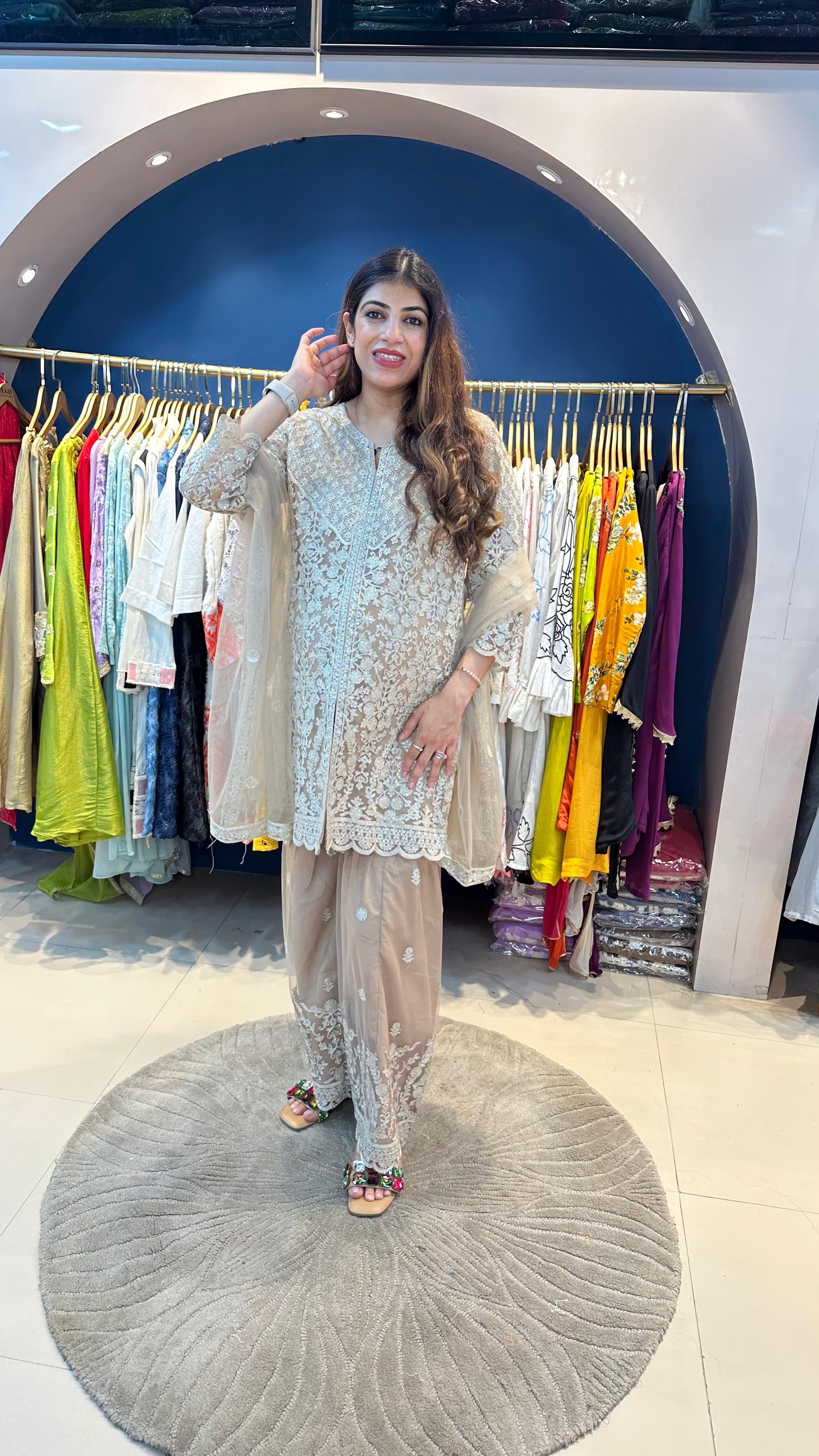 A festive 3-piece sharara set in fine net fabric, featuring complete embroidery with matching kurta, sharara pants, and dupatta.