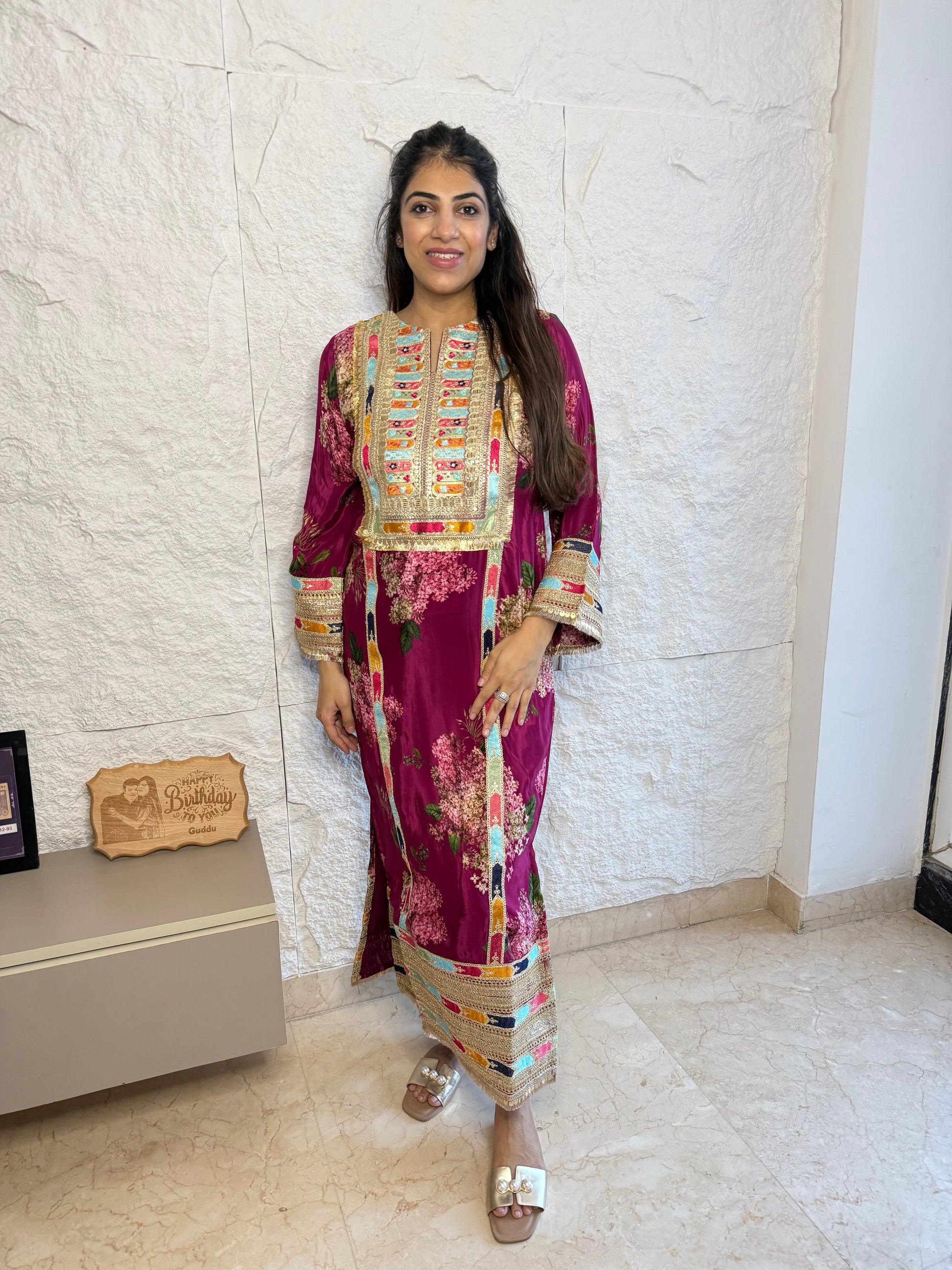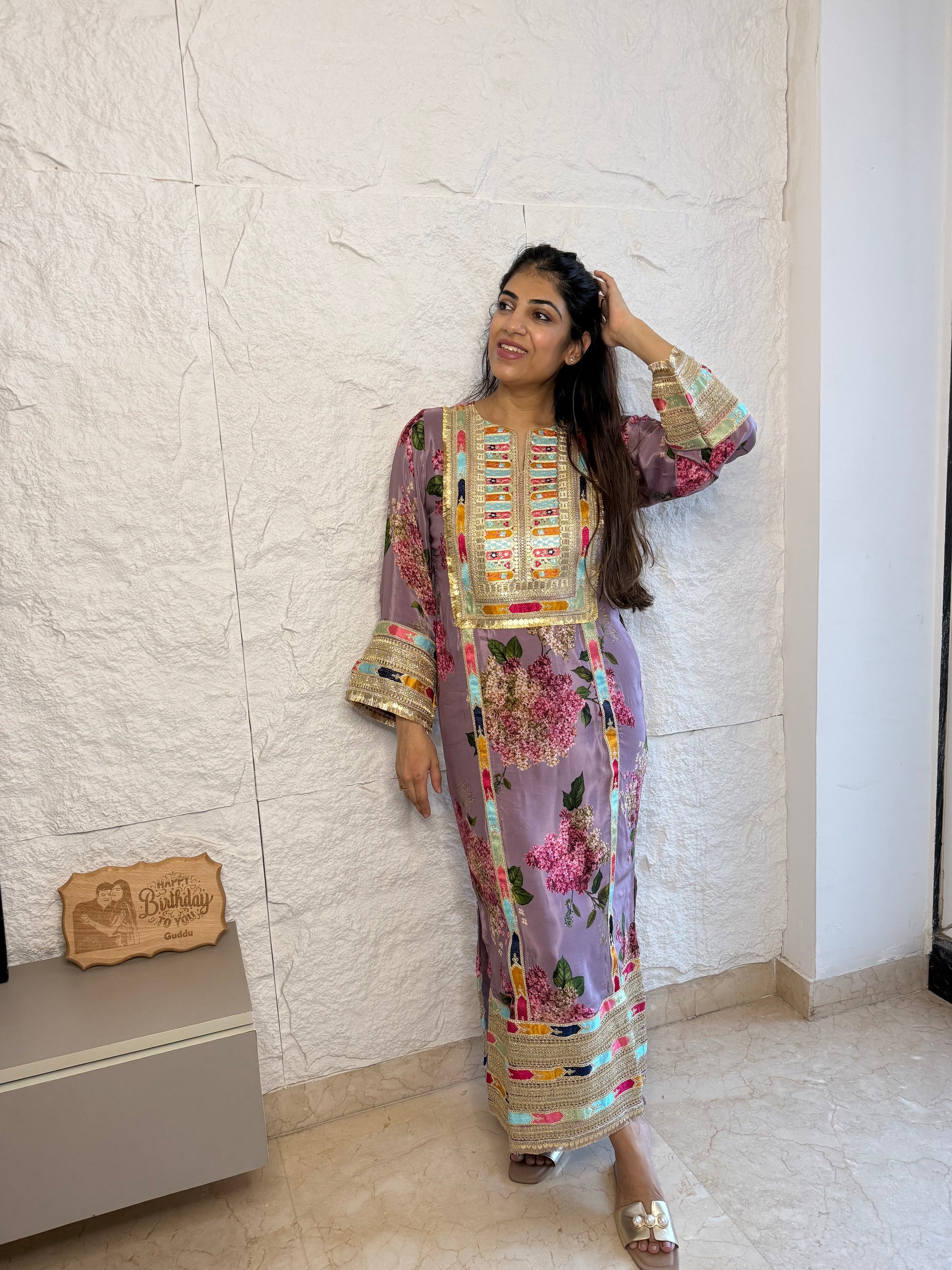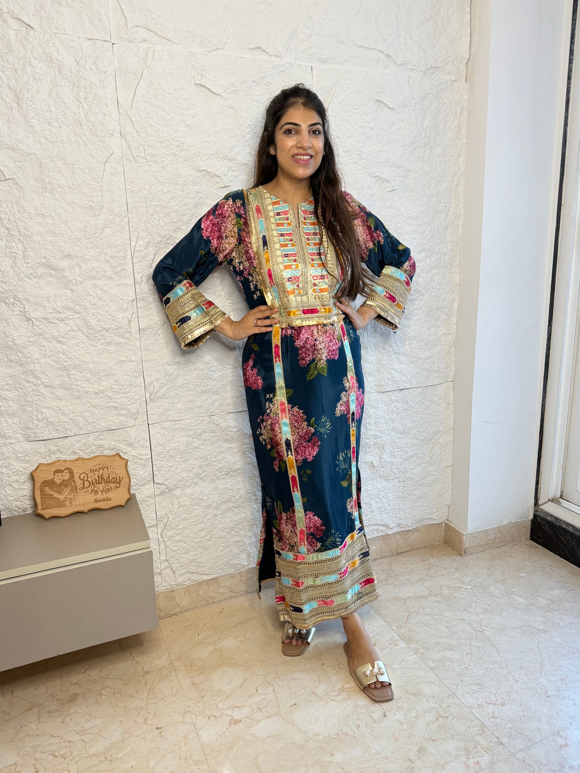 Floral crepe celebrity inspired dress with lace work on neck line & sleeves with side slit