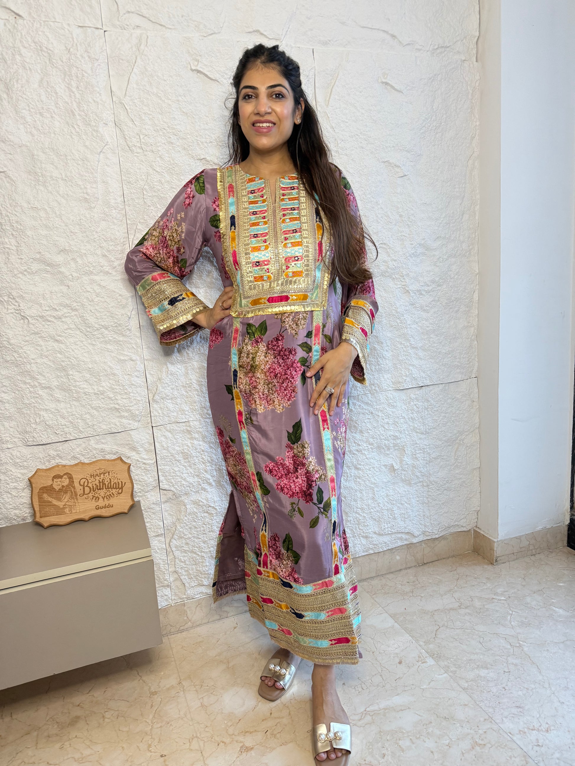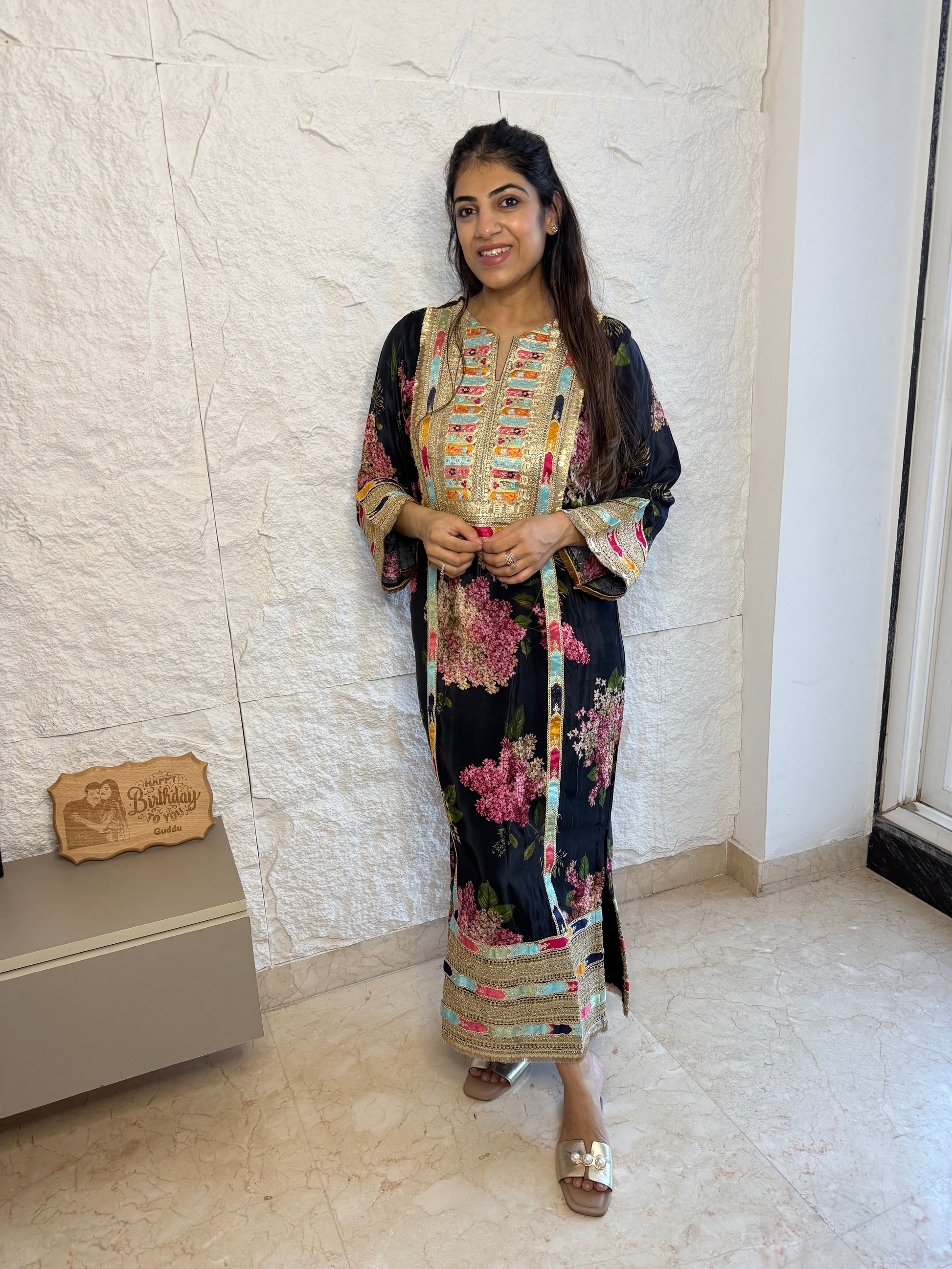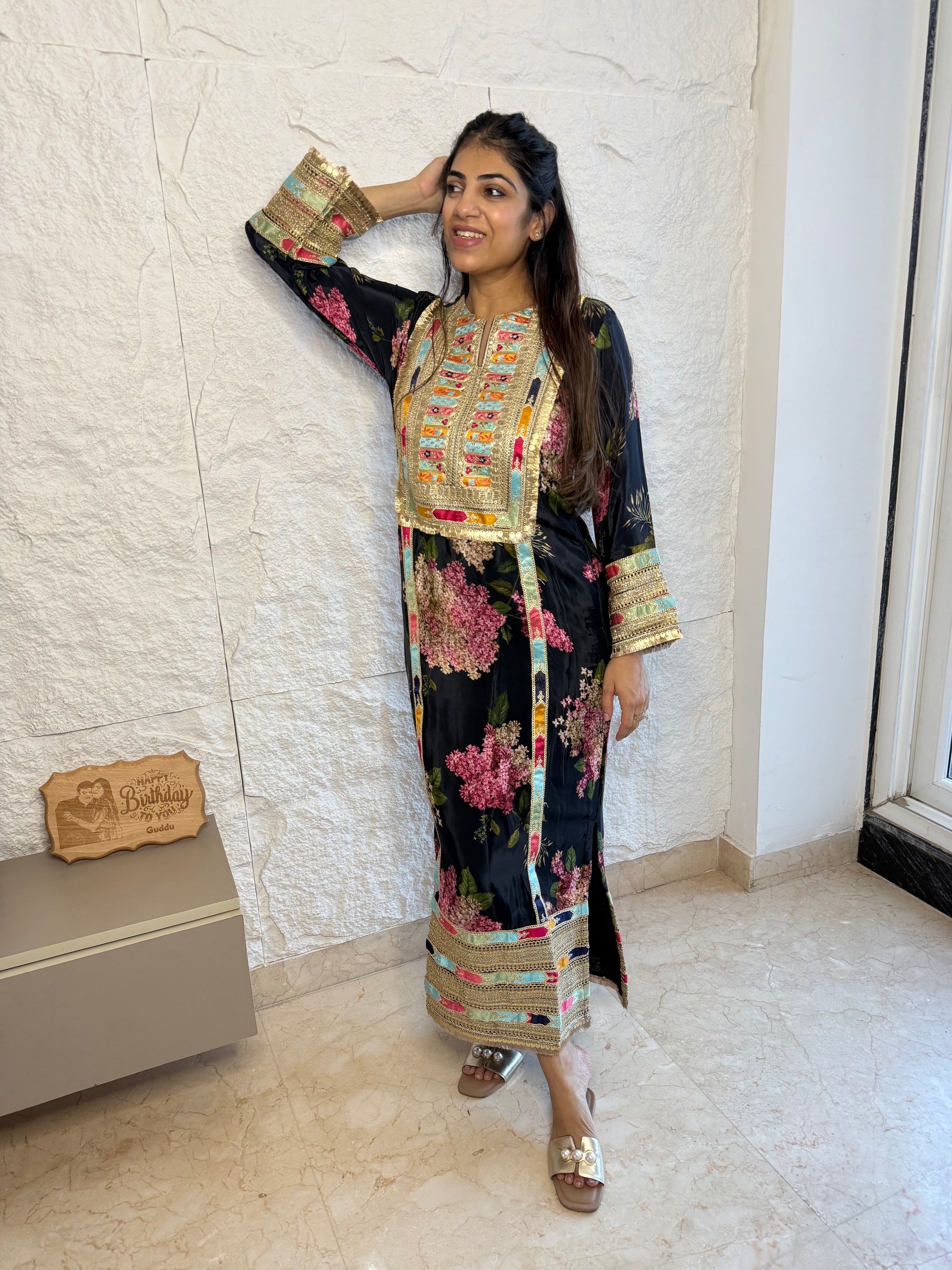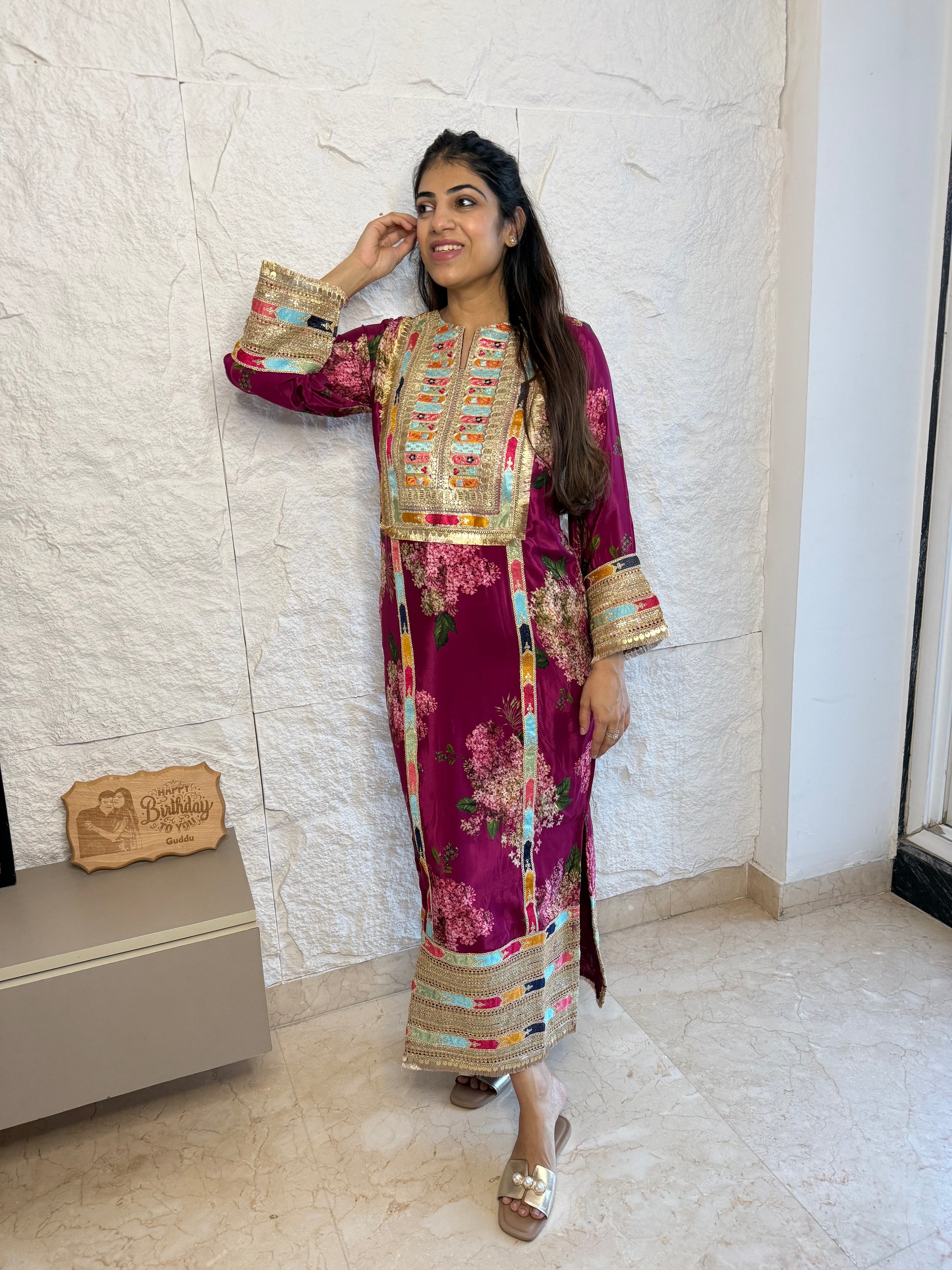 Floral crepe celebrity inspired dress with lace work on neck line & sleeves with side slit