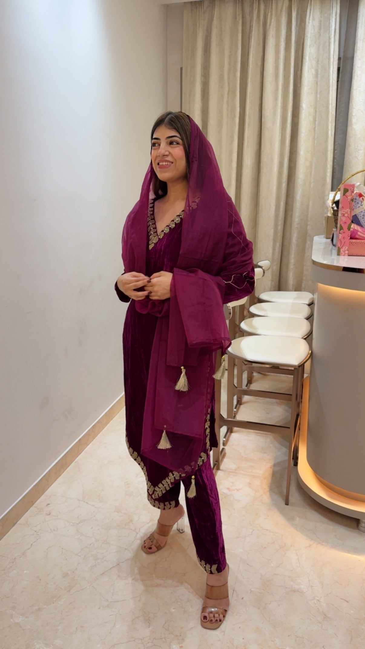 Imported-crushed valvet 3pc suit all handwork with organza dupatta