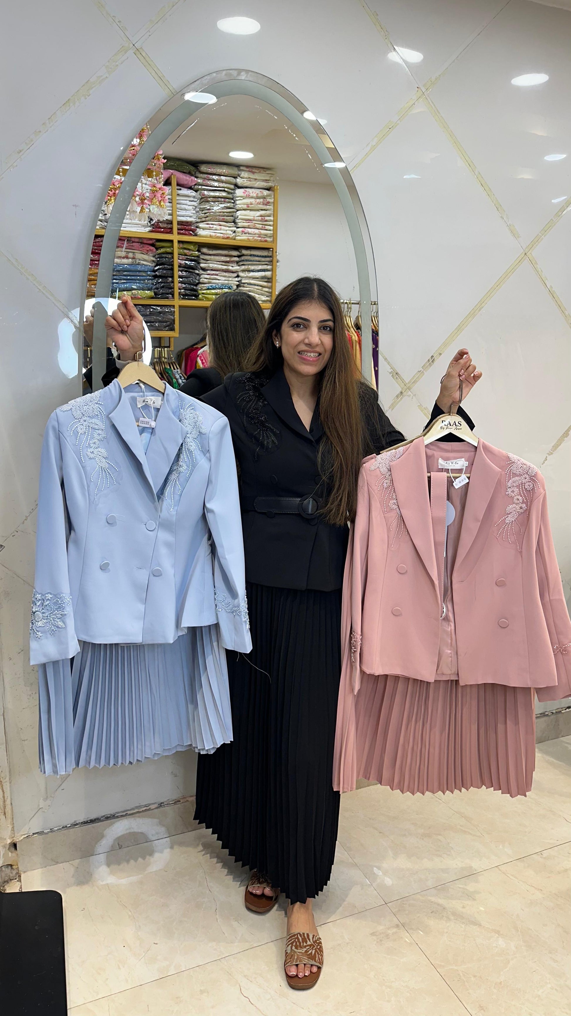 Increase quantity for Japanese fabric western 2 pc, set with pleated skirt and handwork