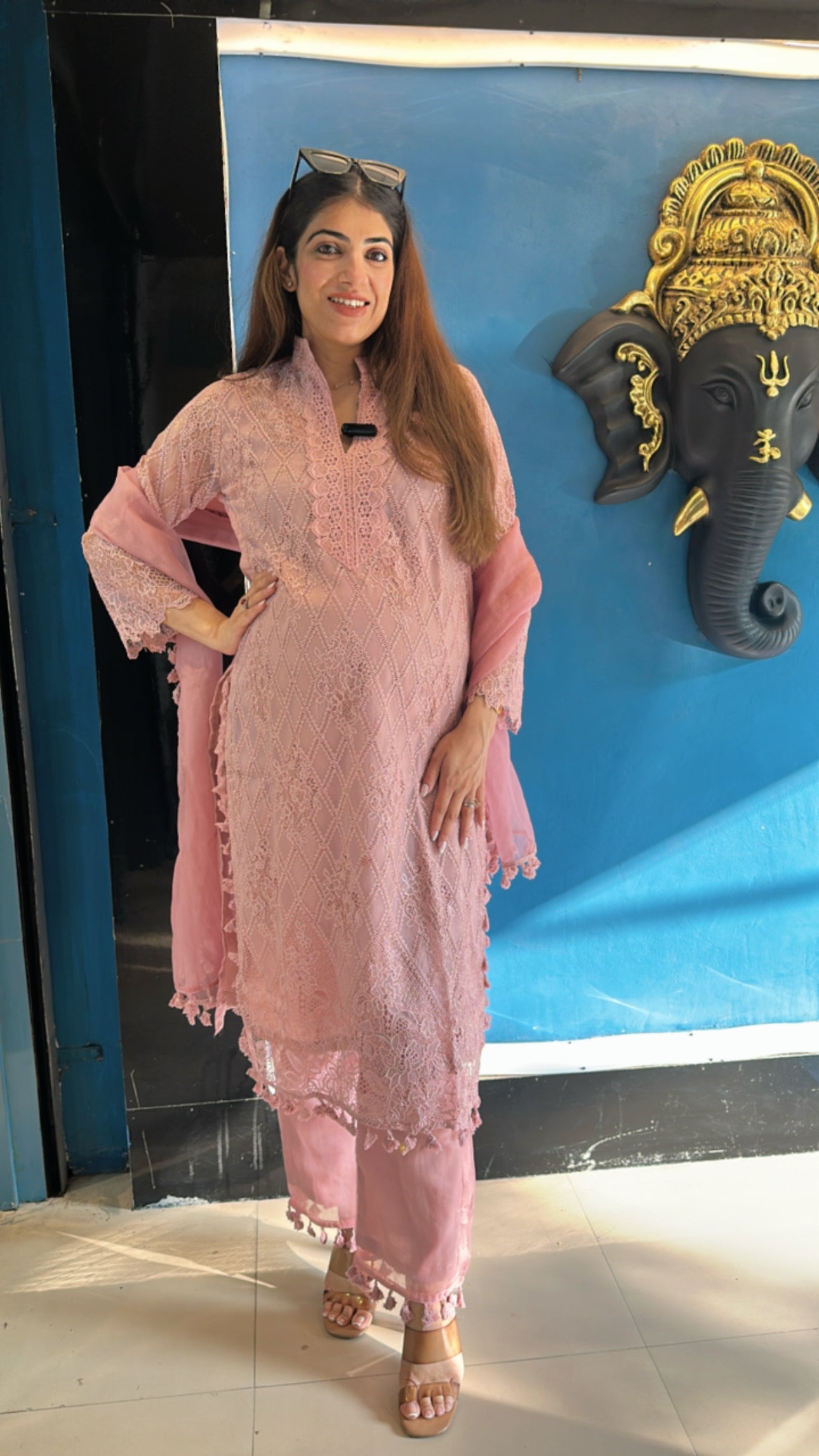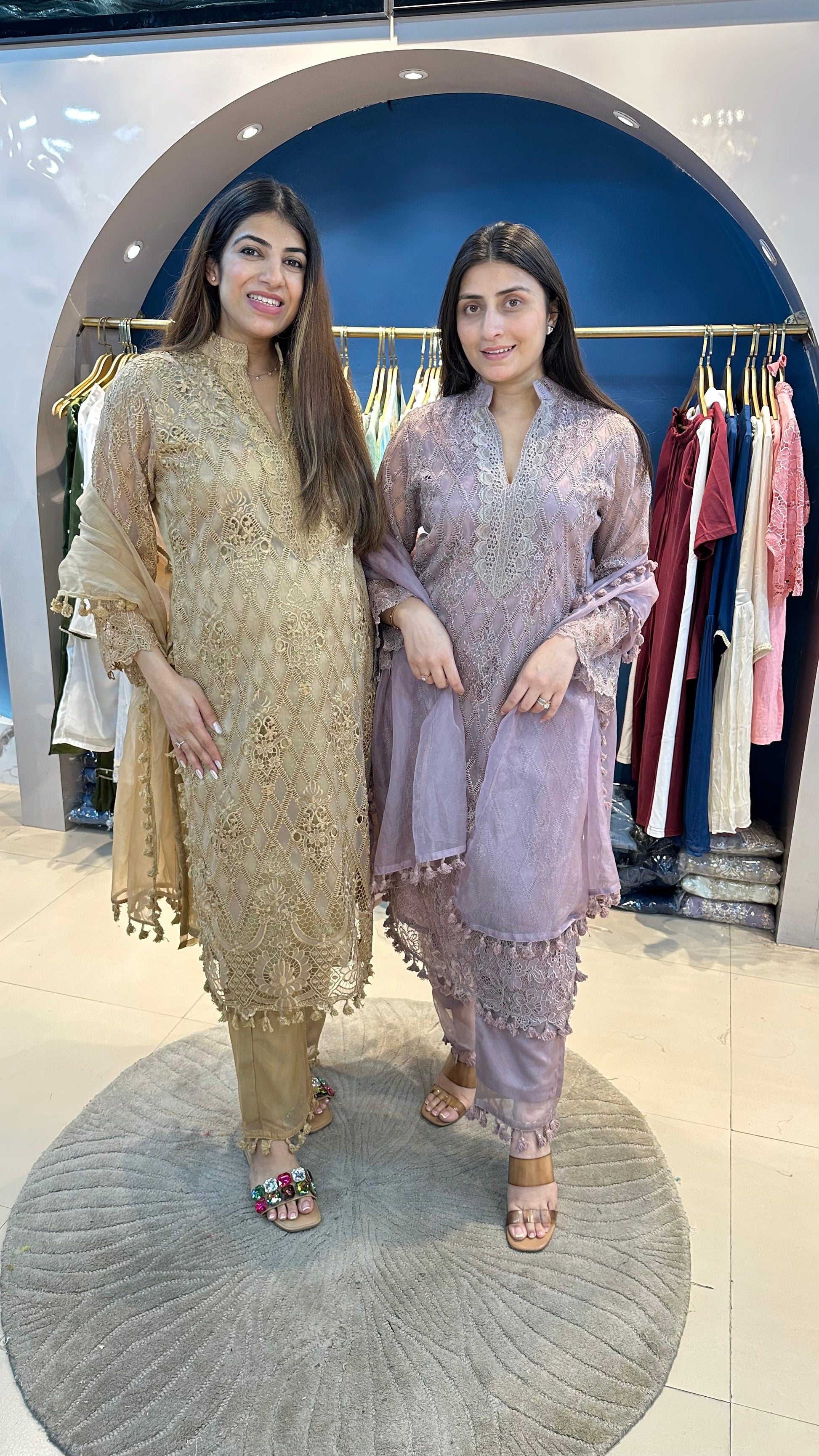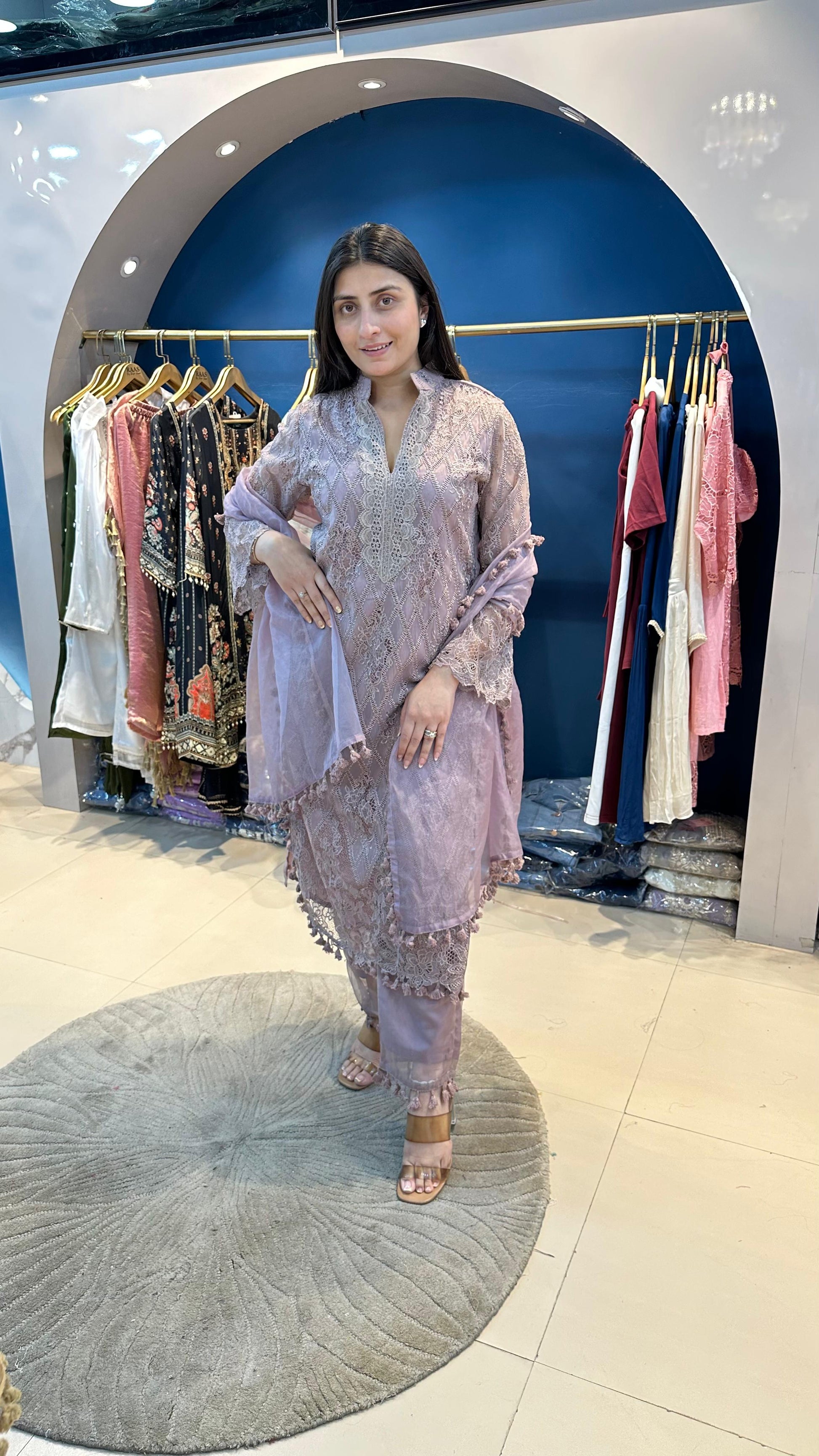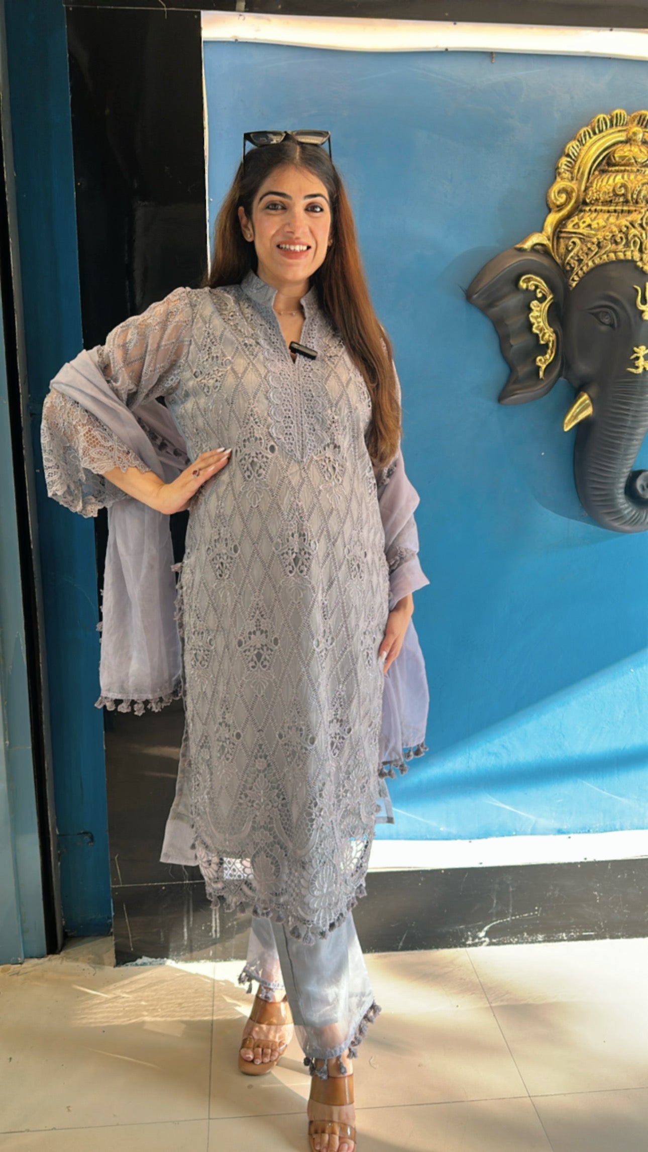 Organza Schiffli Suit with Organza Dupatta with Tassel
