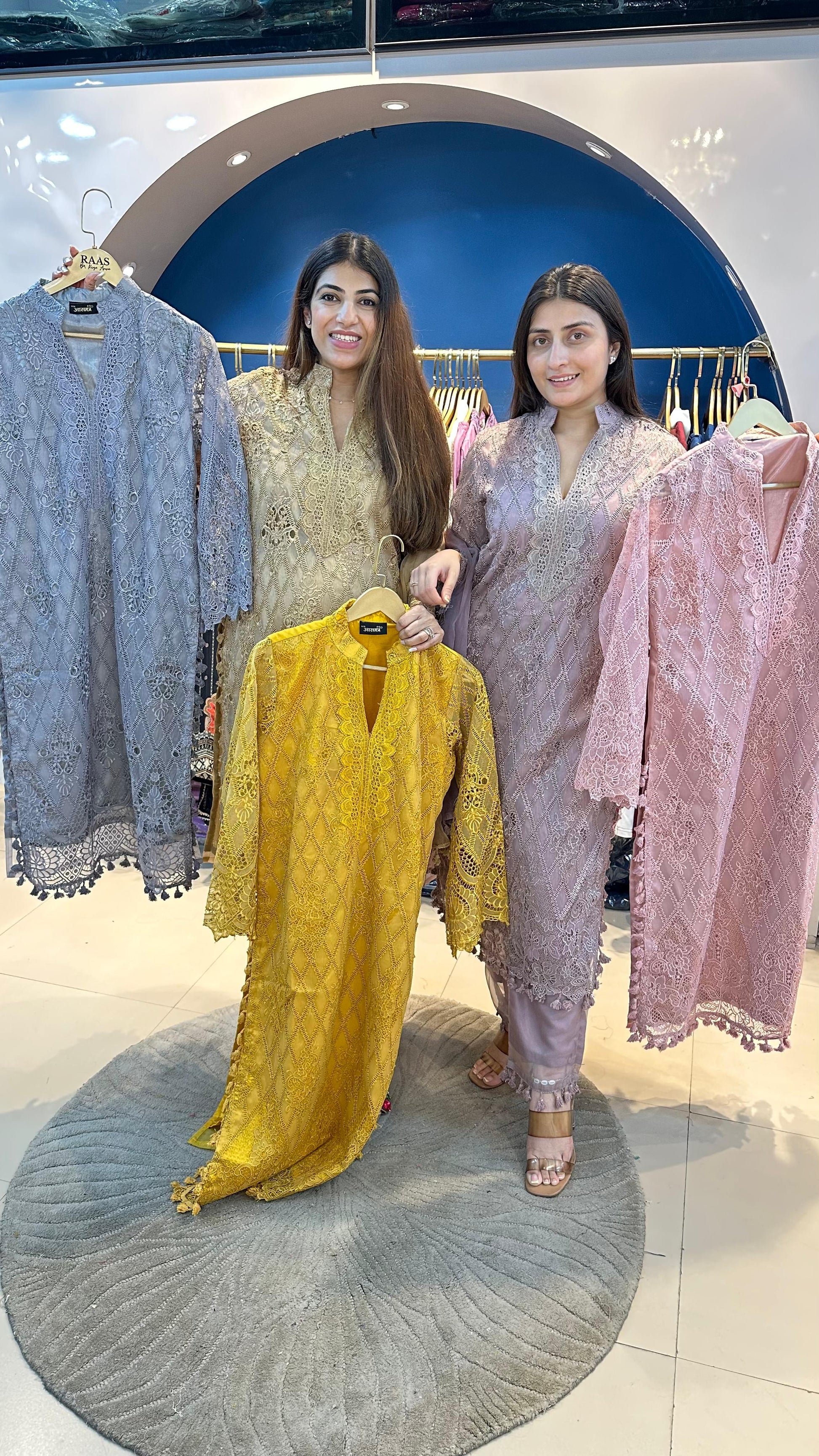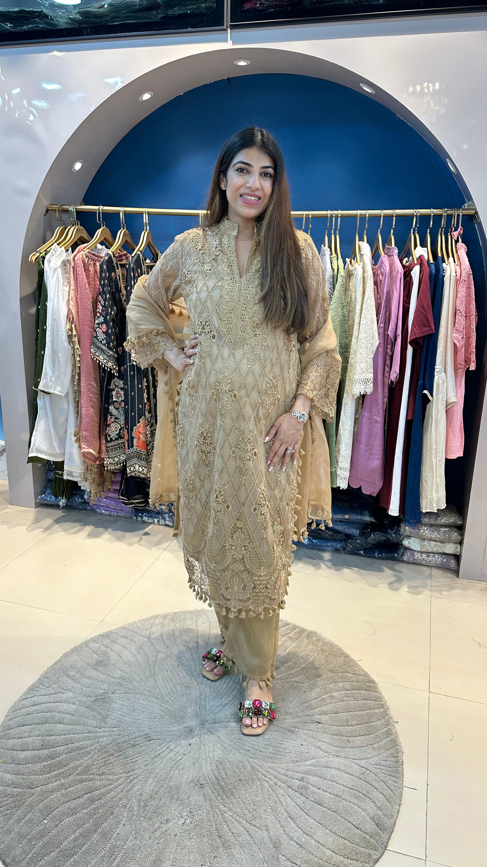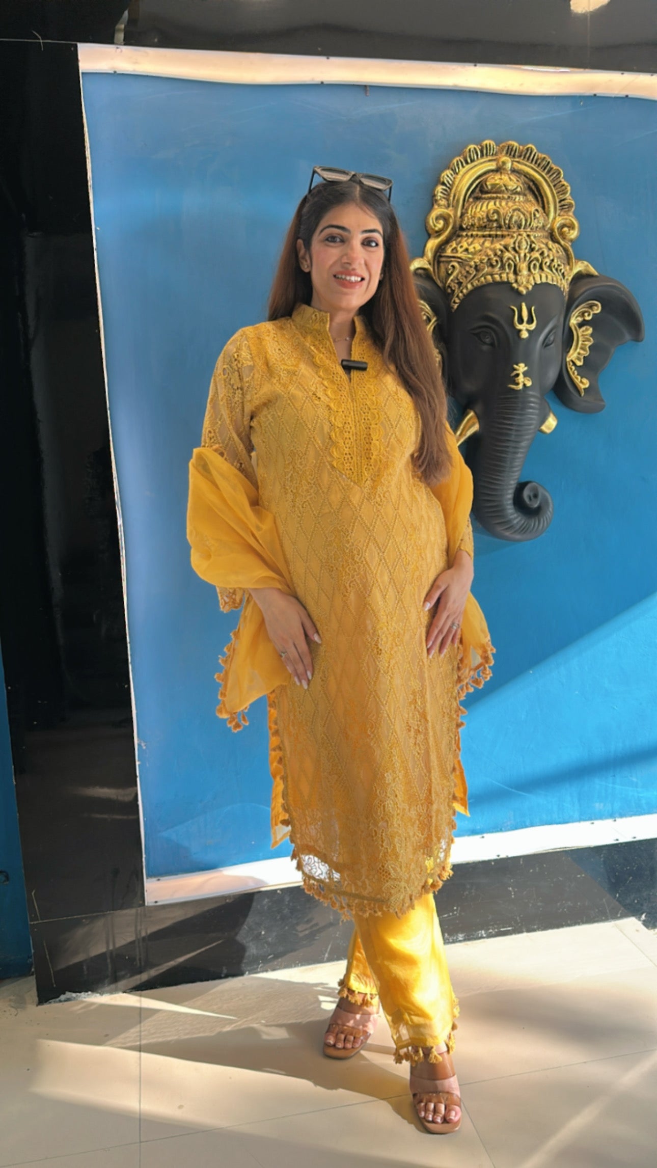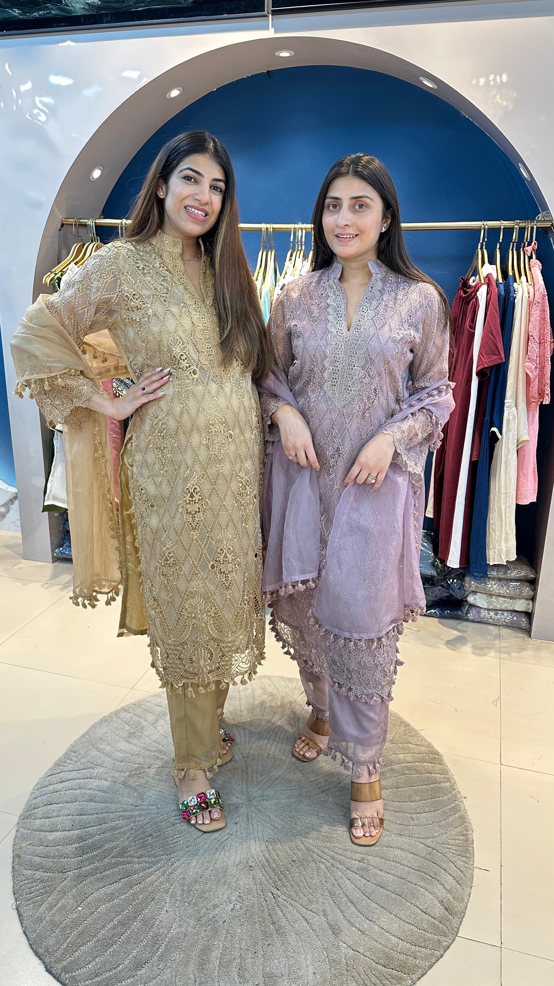 Organza Schiffli Suit with Organza Dupatta with Tassel