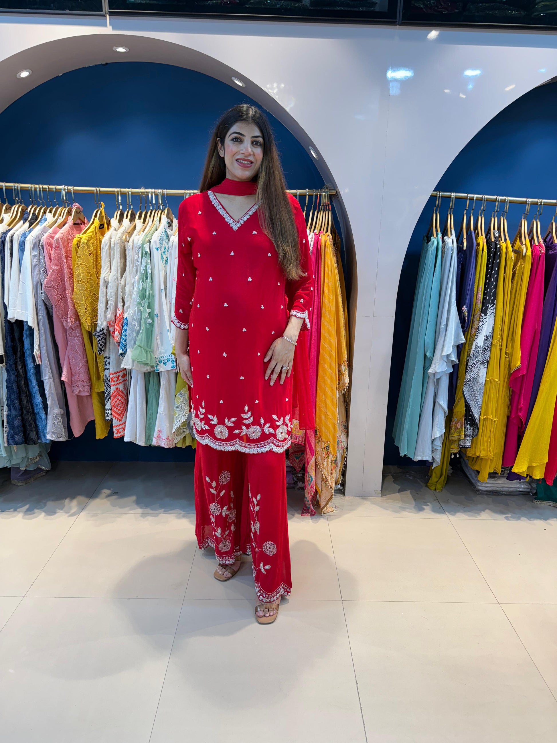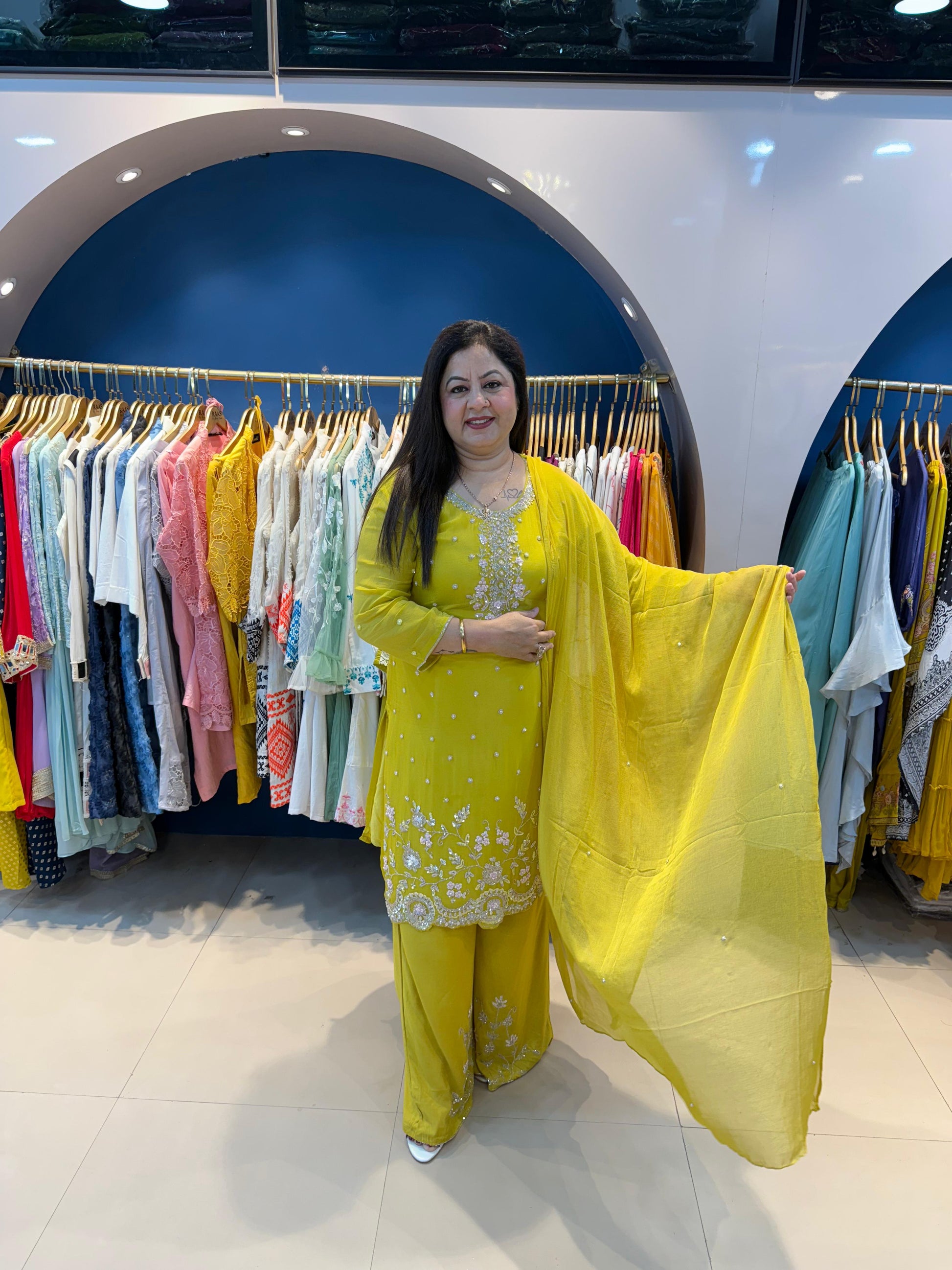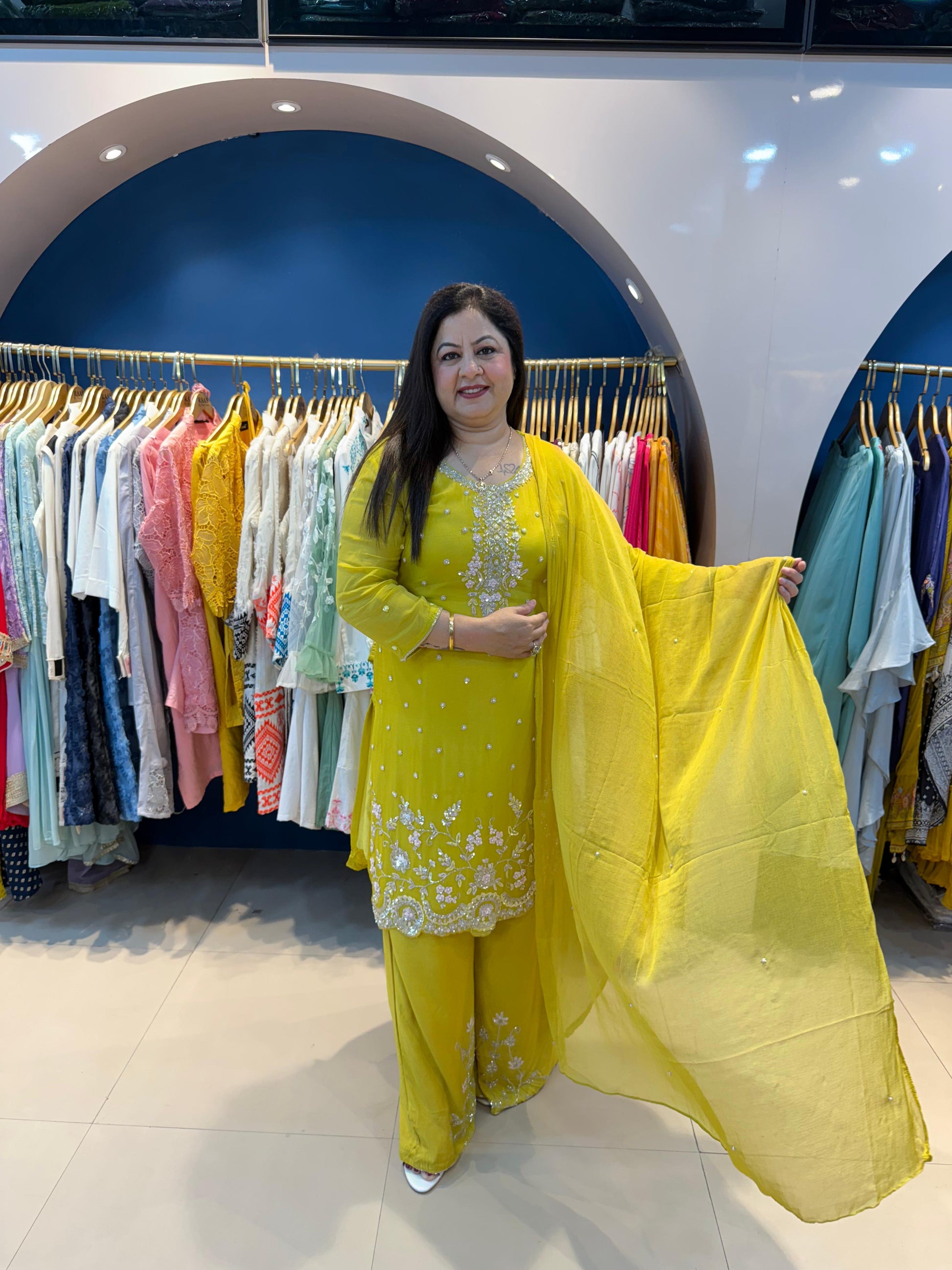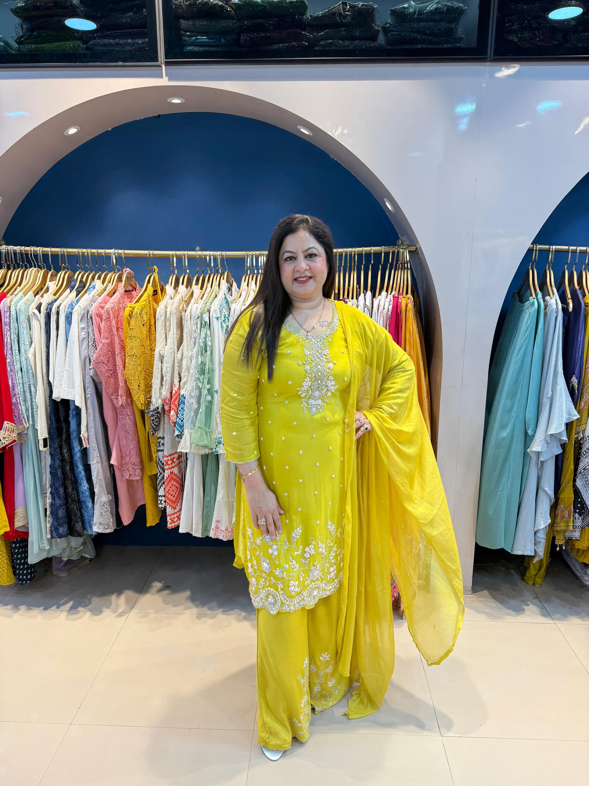 Graceful pure chinon 3 pc suit with intricate handwork, styled with a flared palazzo and matching dupatta — a perfect choice for weddings, festive occasions, and party wear.