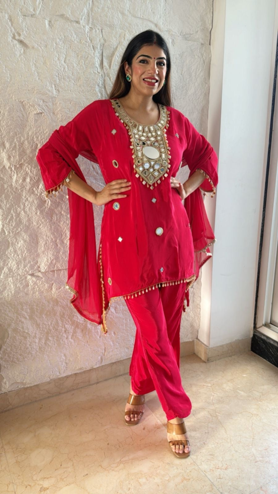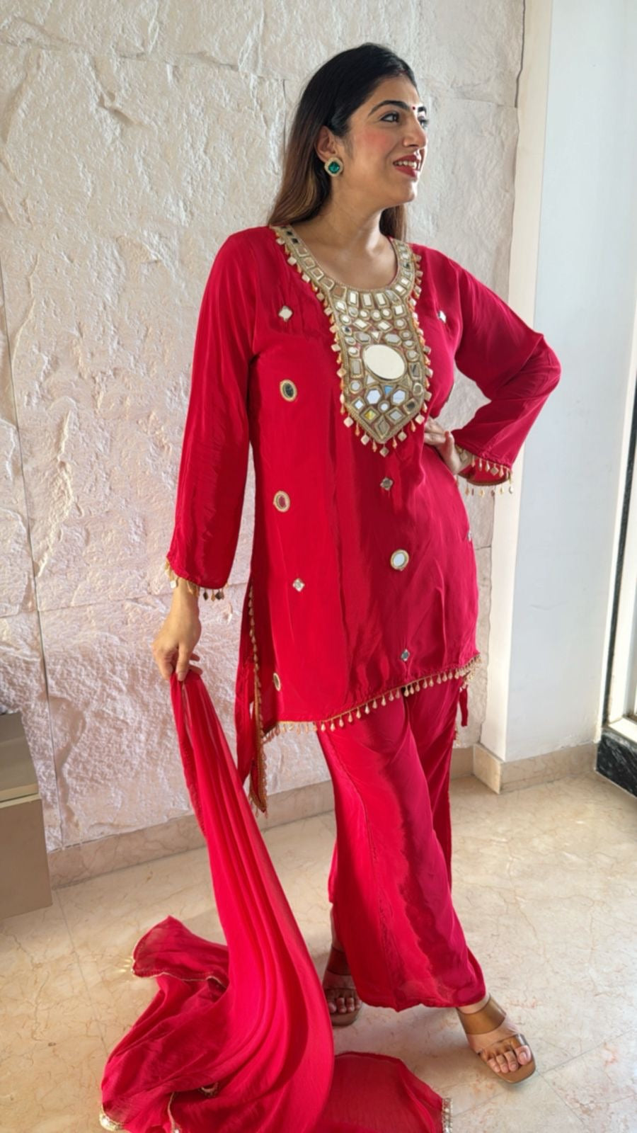 Pure crepe original mirror partywear 3pc set with bell bottom paint