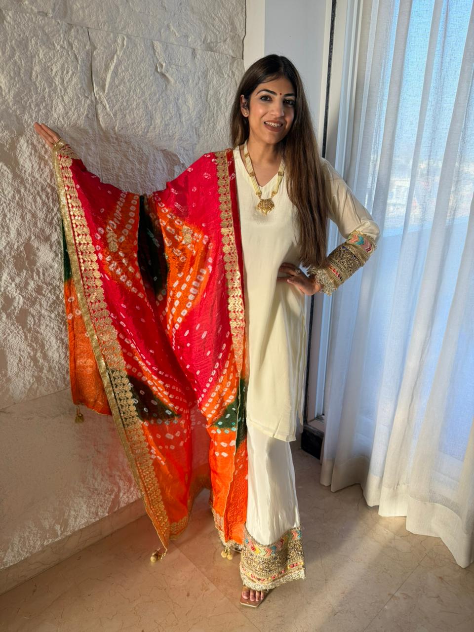 Pure crepe 3 pc, set with necklace nd bandhej duppata with gota lace work