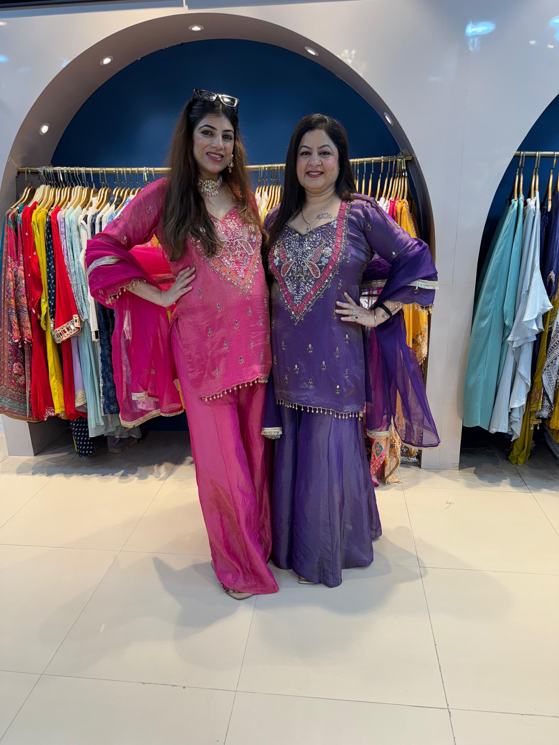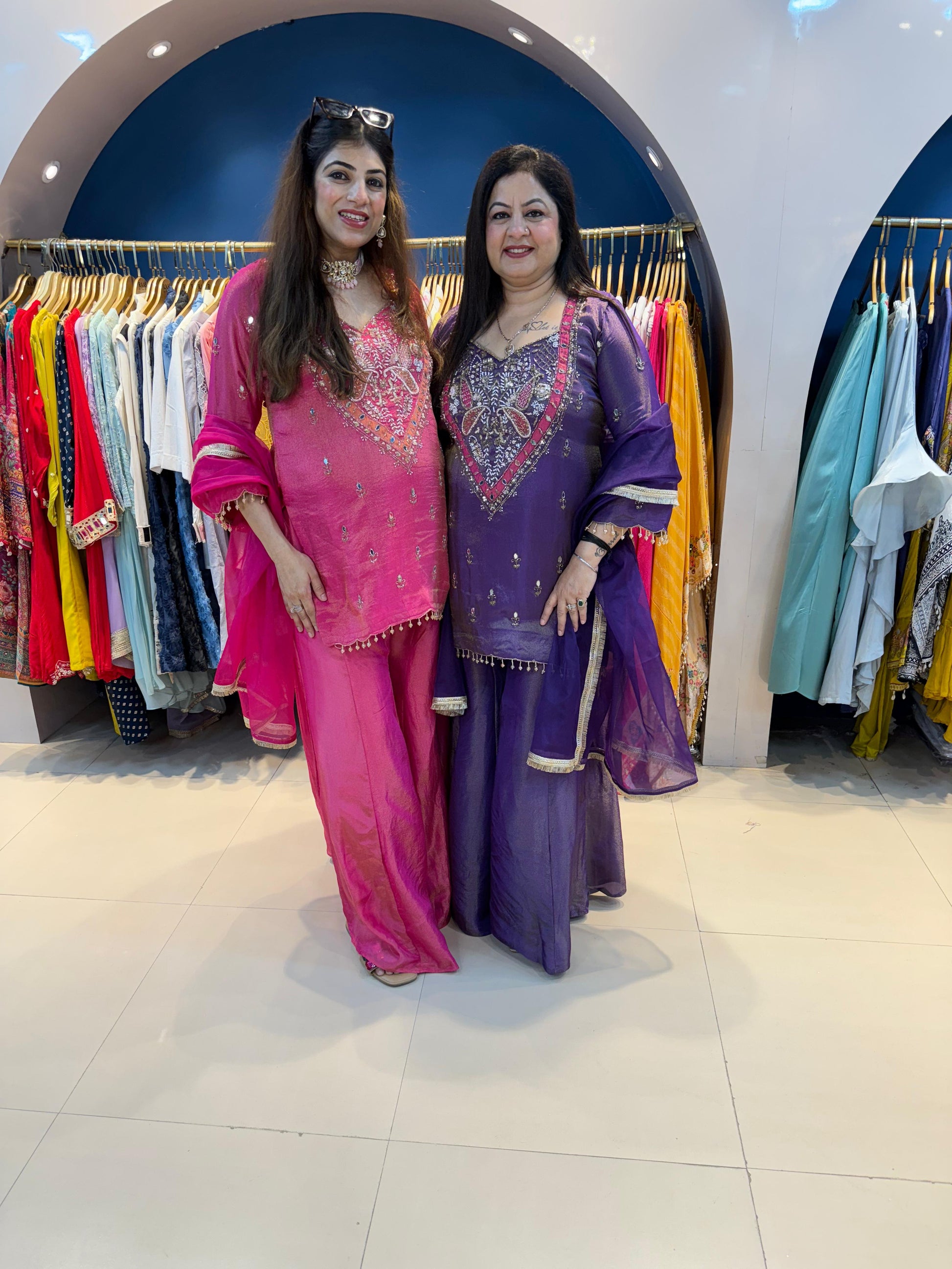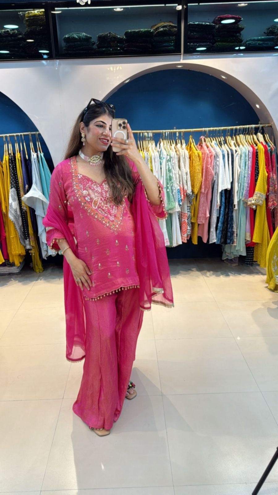 Elegant shimmer tissue 3 pc suit with complete handwork on front & sleeves, paired with a stylish kali palazzo and dupatta. Perfect for party wear, weddings & festive occasions.