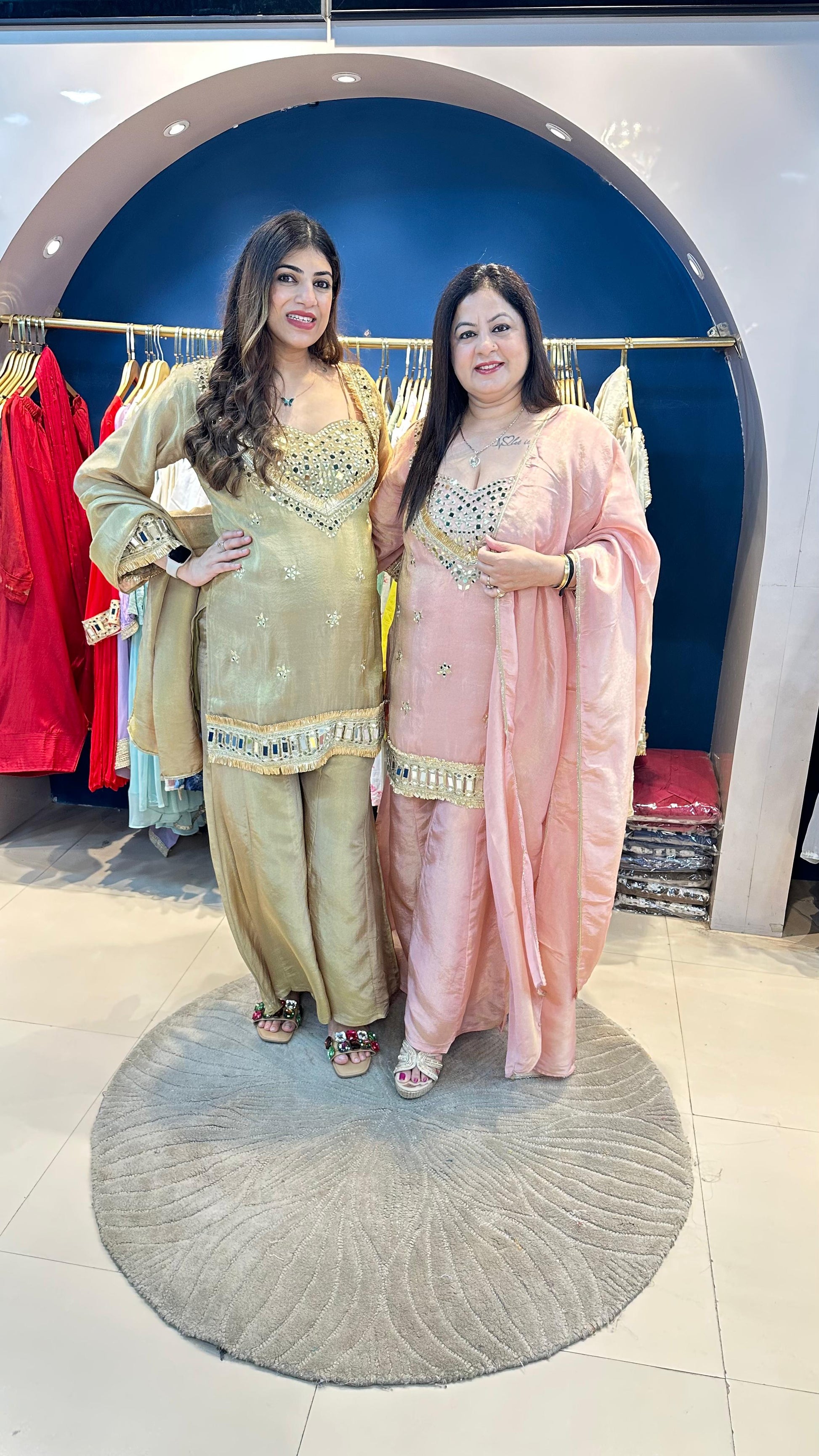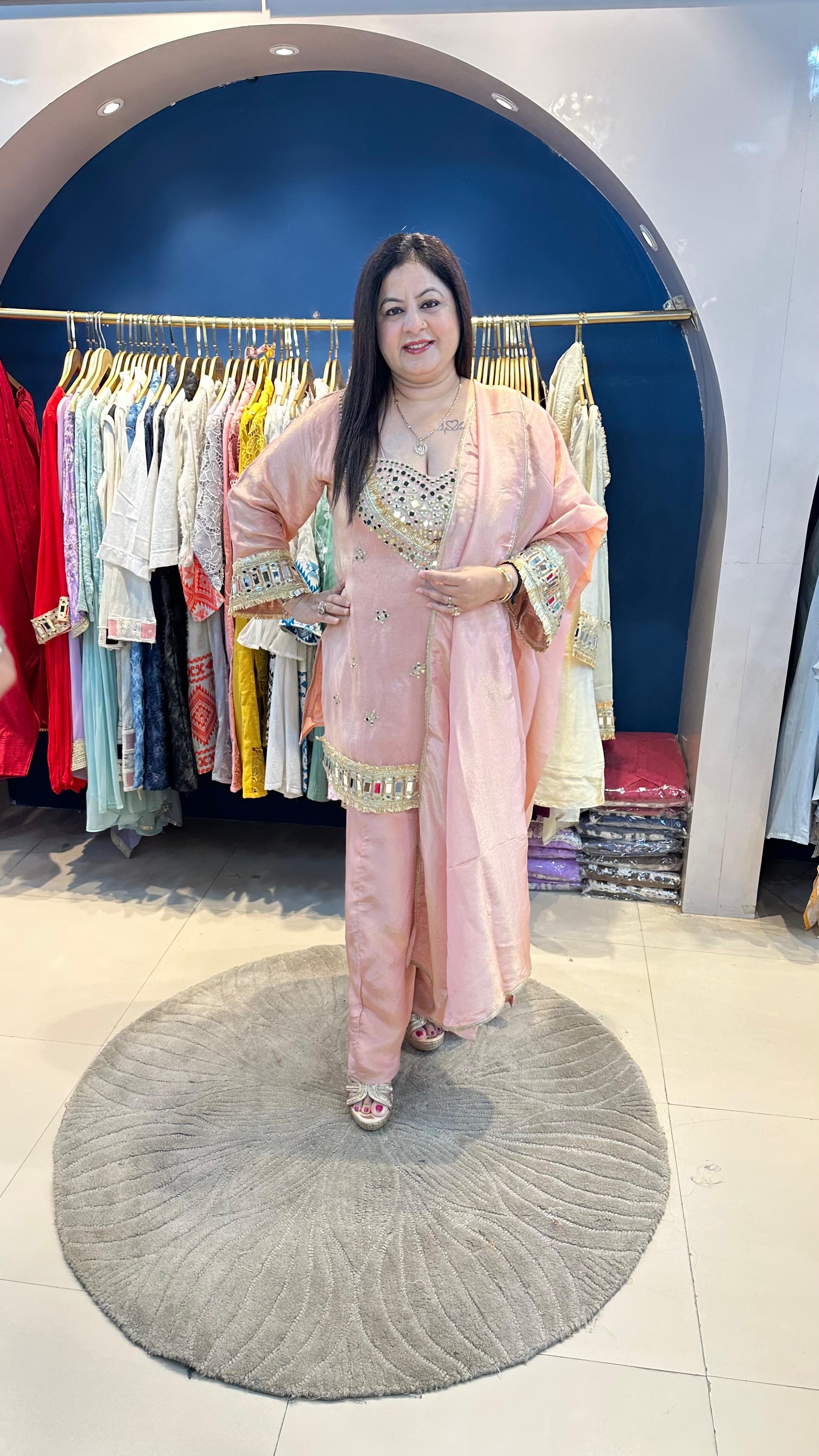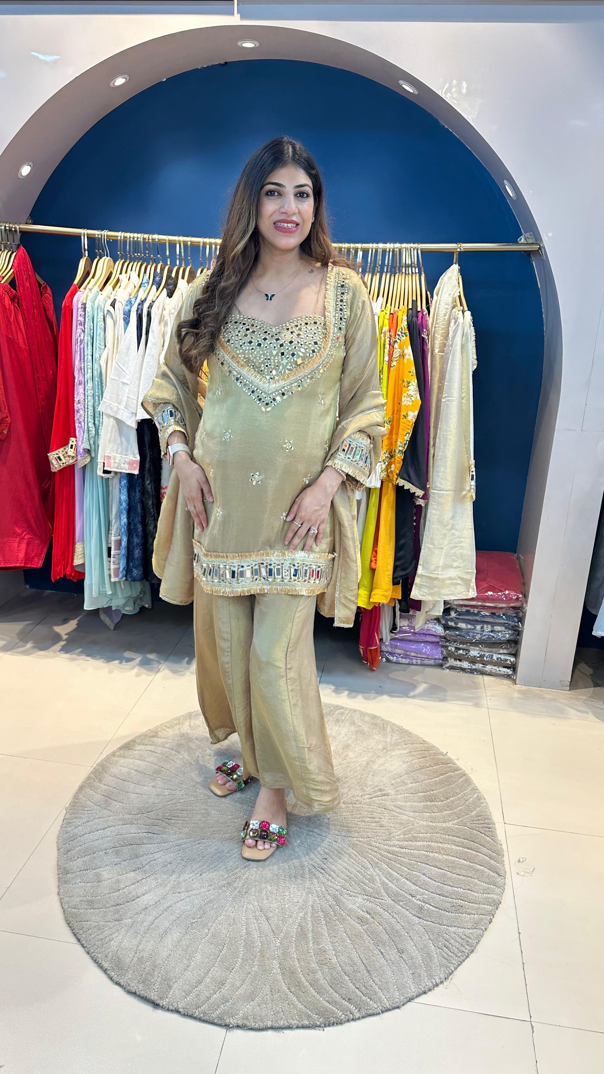 A stunning 4-piece partywear outfit in shimmer tissue fabric, featuring a mirror handwork bustier and flowy kali palazzo pants — perfect for weddings and festive occasions.