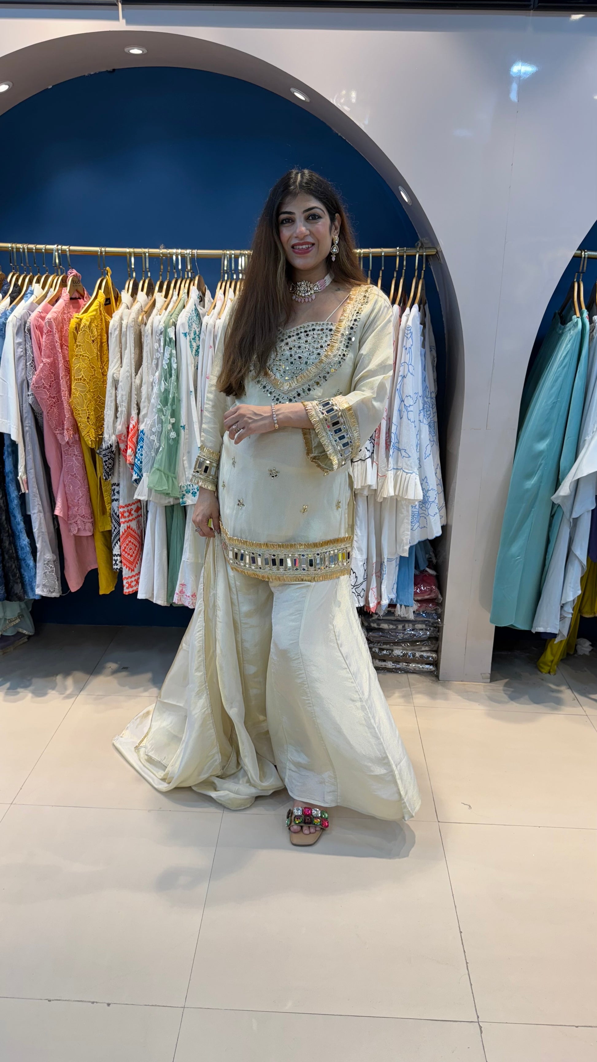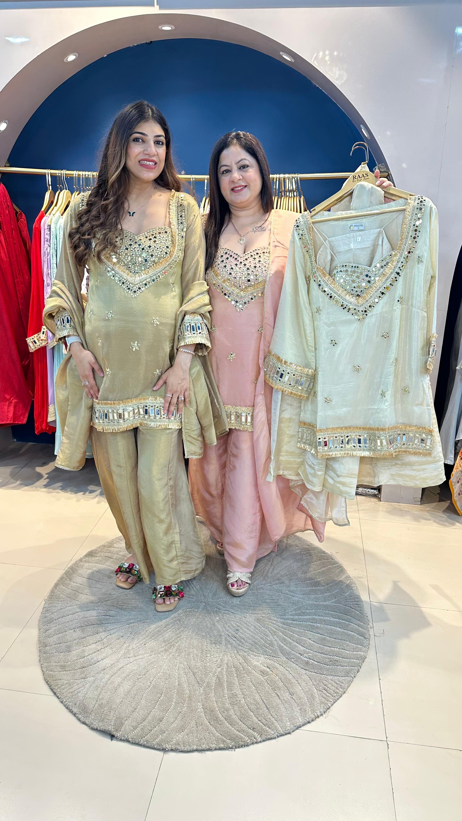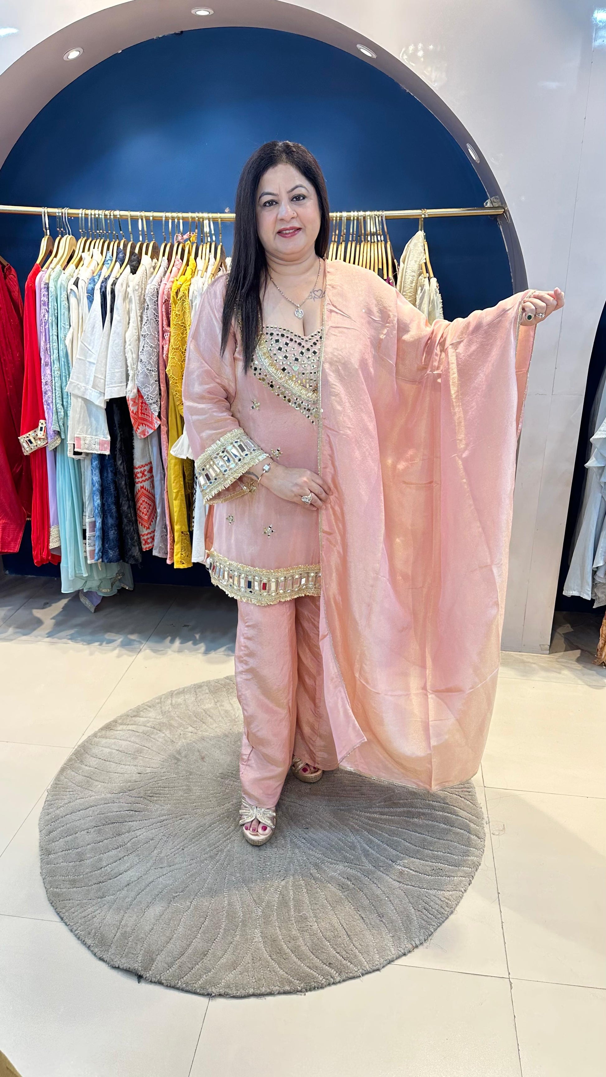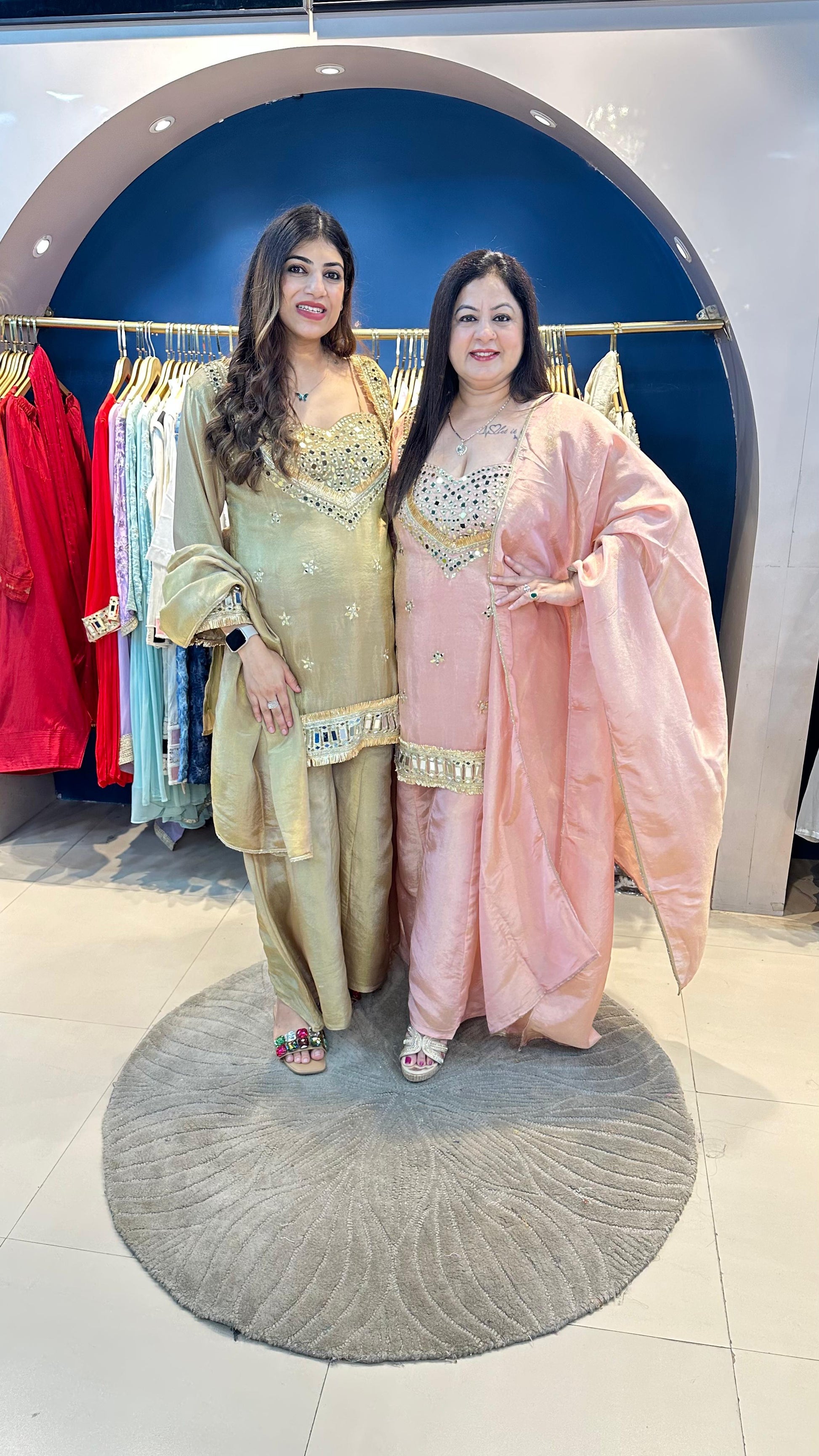A stunning 4-piece partywear outfit in shimmer tissue fabric, featuring a mirror handwork bustier and flowy kali palazzo pants — perfect for weddings and festive occasions.