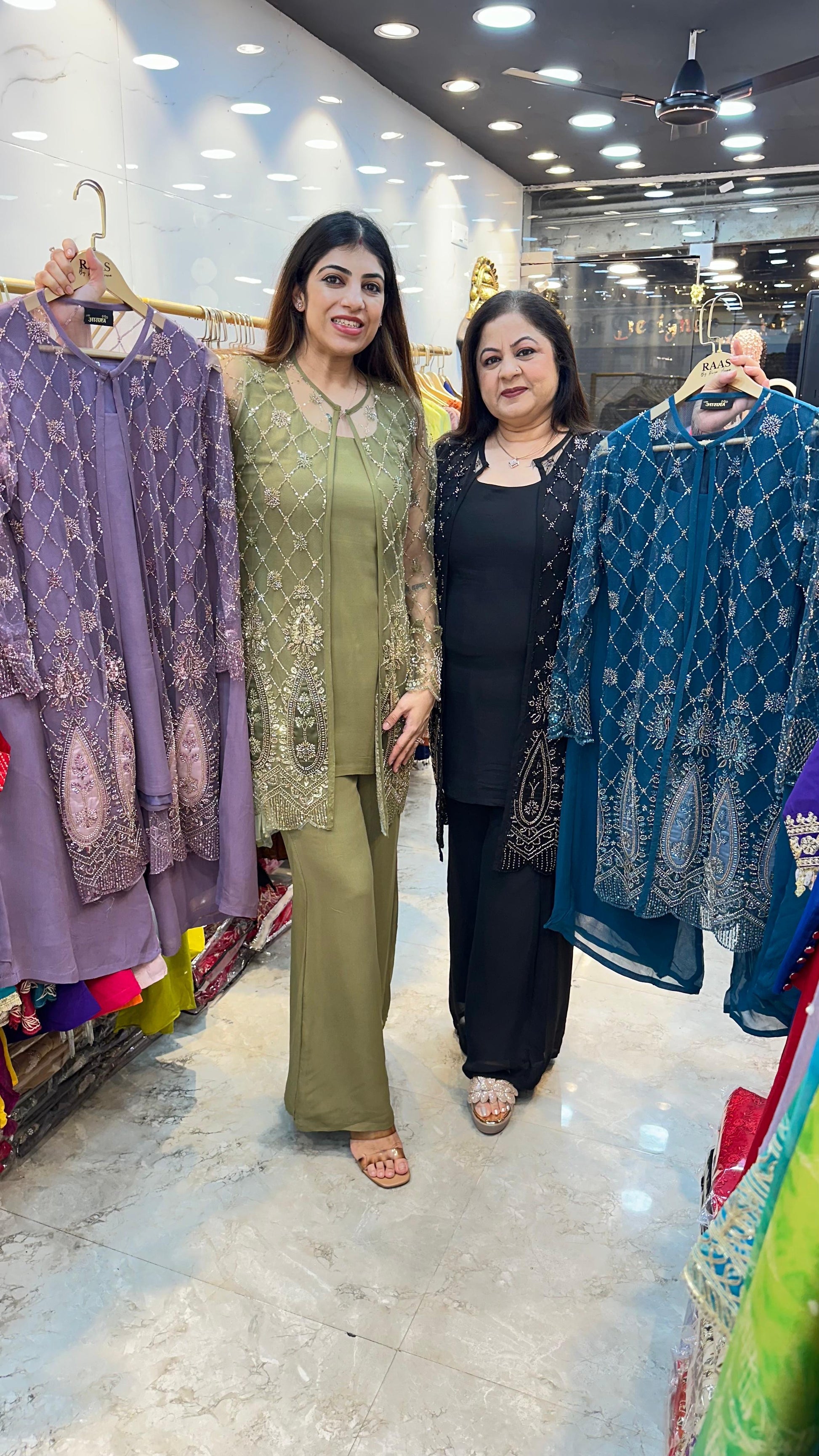 Decrease quantity for Viscose georgette indo-western 3pc set with net fabric jacket on all handwork front nd back